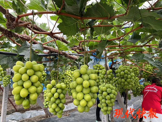 “果实个个饱满多汁,香味芬芳、甜而不腻。”大家纷纷发出赞美之词。“目前我们主要种植的品种是阳光玫瑰,南太湖特早,目前上市是双层保温的品种,在盐城比较早,种植的阳光玫瑰和南太湖特早口感串形好,比其它市场都优先上市,目前得到了是广东、上海等地客户的亲睐,预计销售突破千万元。”盐城富丽葡萄庄园负责人包进锋一边采摘葡萄,一边介绍道。