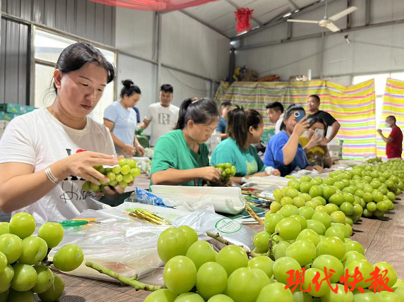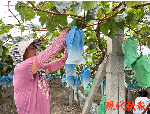 葡萄丰收也给附近的村民们提供了就业岗位。“我在这里工作5年了,每年有2万多元的收入。”73岁的村民王迟林是大丰区沈灶镇双灶村的村民,她正在葡萄大棚里整枝、采摘,“我家距离这里只有几里路,上班也不远。” 王迟林说,在葡萄园里工作的大多都是附近的村民。包进锋说,他的葡萄园带动了60多人就业。