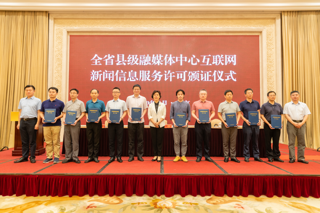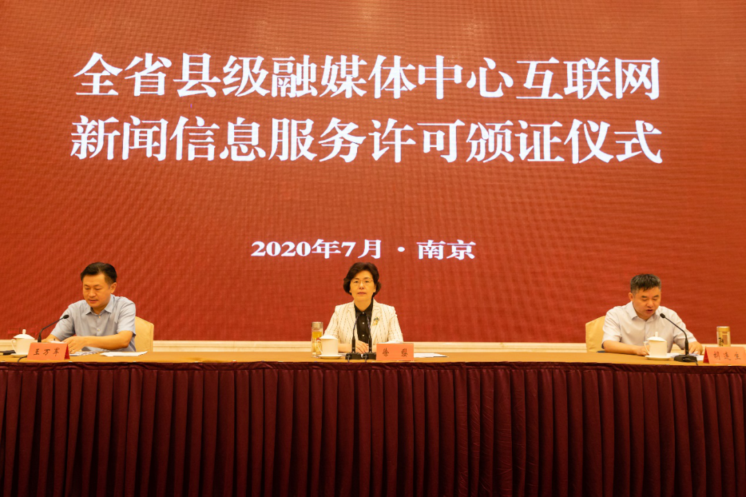 全省县级融媒体中心互联网新闻信息服务许可颁证仪式现场7月22日上午,全省县级融媒体中心互联网新闻信息服务许可颁证仪式在南京举行。江苏省委网信办主任兼省委宣传部副部长徐缨、省委网信办副主任胡连生、王万军参加活动,为全省32家获得互联网新闻信息服务许可的县级融媒体中心颁发许可证。
