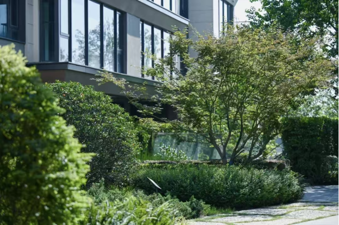 小区大门由约600块高湖石纯手工打造,一个立方高湖石有2吨重,一块高湖石挂墙上,需要四个工人外加一台大型吊车;环岛落客区挺立的80年树龄的榔榆,是项目历时3个月,跑了6个城市,3000多公里,百里挑一选来的;为了保证宅间巷道的绿化效果,吾山选择了12栋宅间巷道做种植样板,几经调试,甚至不惜拆掉重来,才最终调试到最适合项目的植物种植方式;园区内随处看到的黄色景石,是全靠人工抬过来的,单一块黄色景石就需要9个成年男子抬过来。