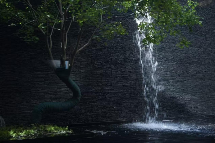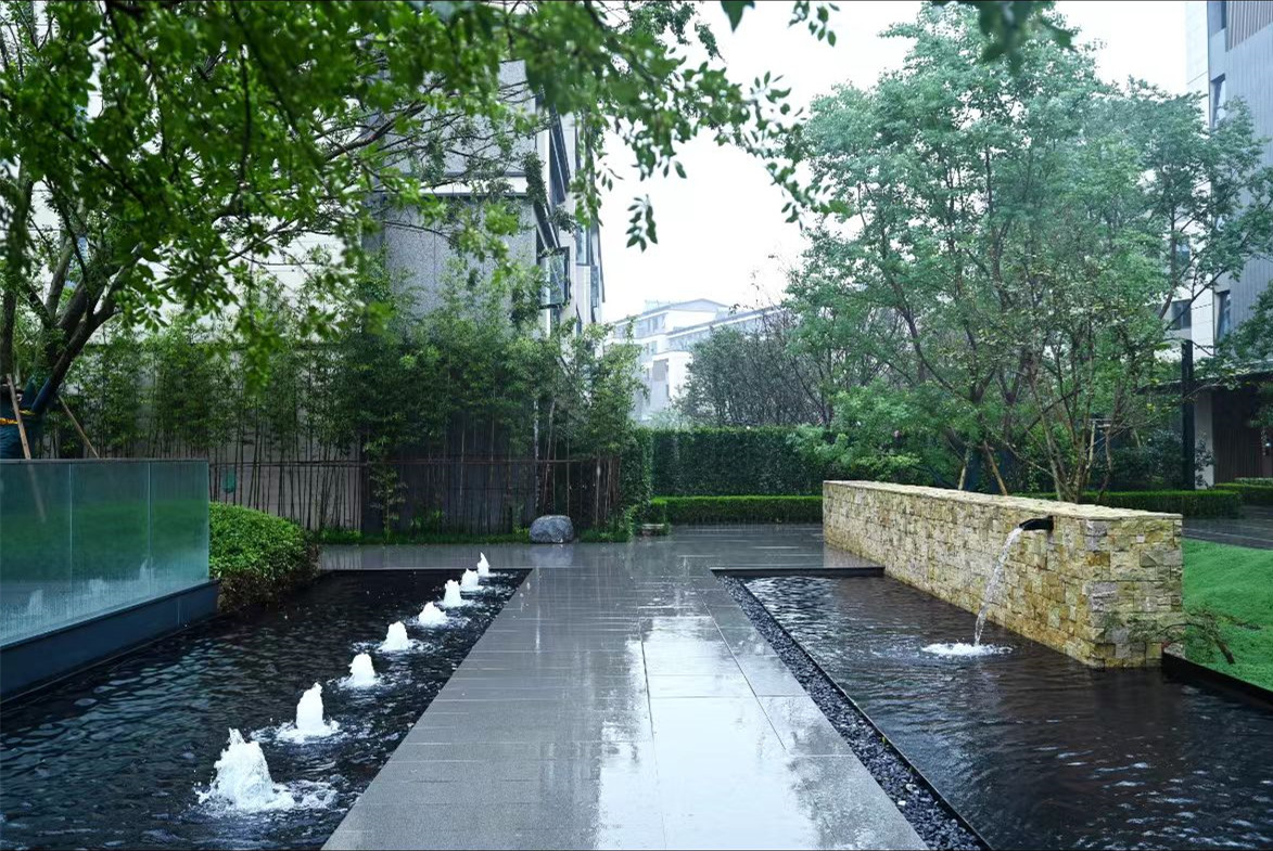 穿过风雨连廊,在庭院式归家大堂内聆听约5米高叠瀑叮咚,让人卸去了一身疲惫。