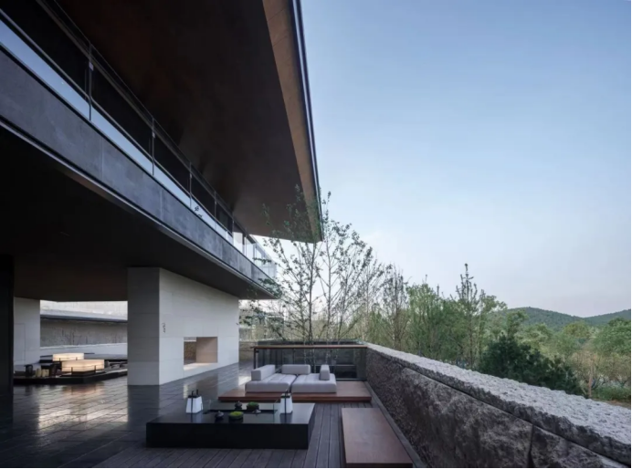 入口进来,则是由约600㎡无雨归家连廊构筑的“山林雅院”,厚重的景墙与自然美景相得益彰。