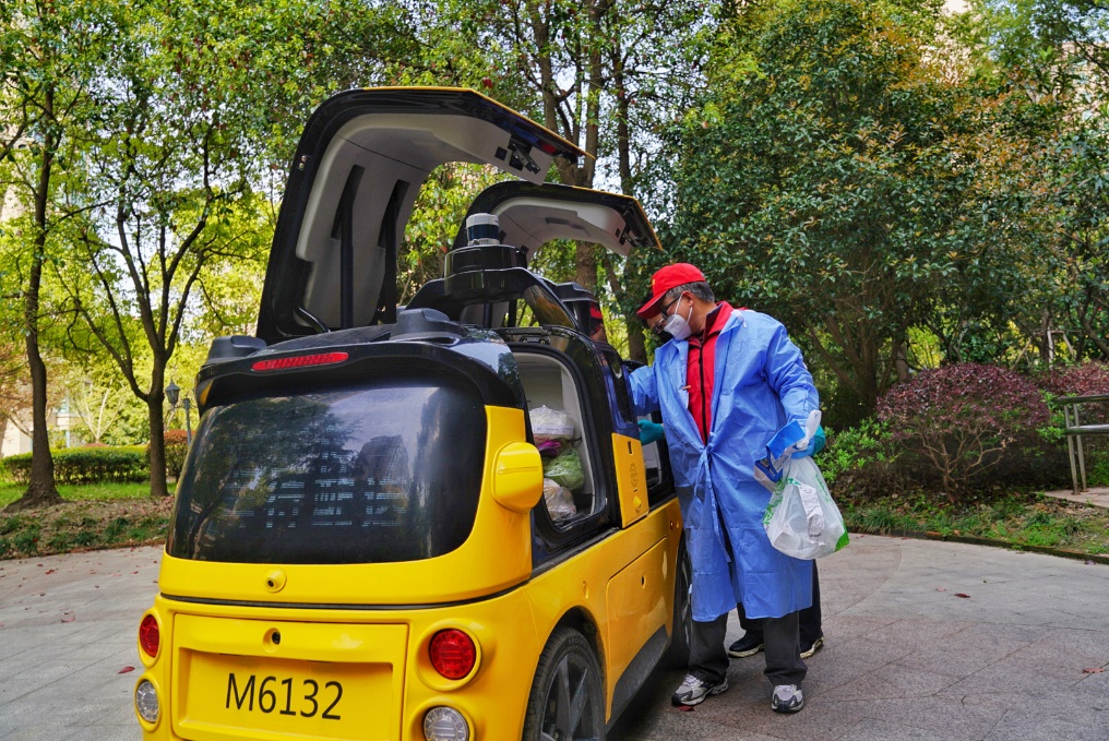 在配送现场,站点工作人员会先将订单放入车厢内,在车门关闭后,车辆将自主行驶至社区内用户单元楼下,由驻守在楼下的志愿者从车内取出,“每完成一次配送后,我们都会及时对车内外进行全面消毒,减少隐患。”