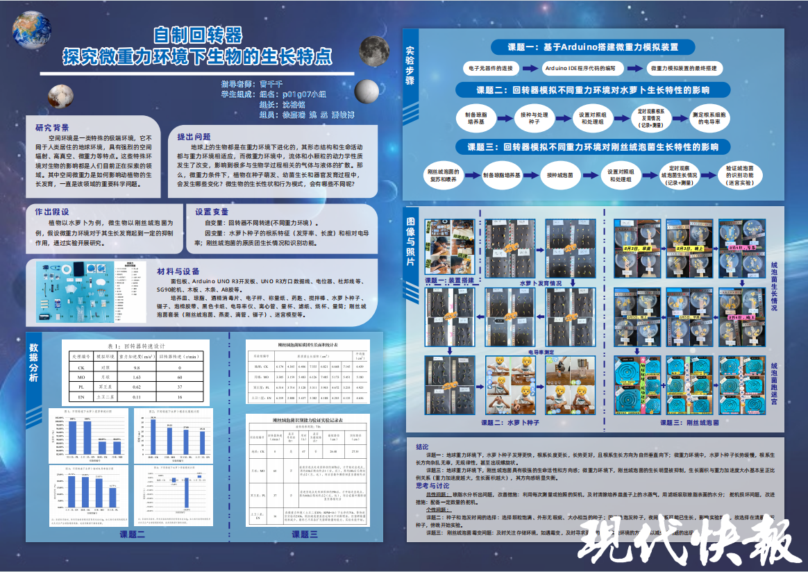 “空间环境是一类特殊的极端环境,它不同于人类居住的地球环境,具有强烈的空间辐射、高真空、微重力等特点。这些特殊环境对生物的影响都是人们目前正在探索的领域。其中空间微重力是如何影响动植物的生长发育,一直是该领域的重要科学问题。”沈裕铭、徐嘉瑞、姚丞、潘峻博4名同学在曹千千老师的指导下,对天文航天领域的微重力进行了探究,通过自制回转器探究重力环境对生物的生长特点,他们通过全流程科研训练,进行思考和讨论,并得出了自己的结论。