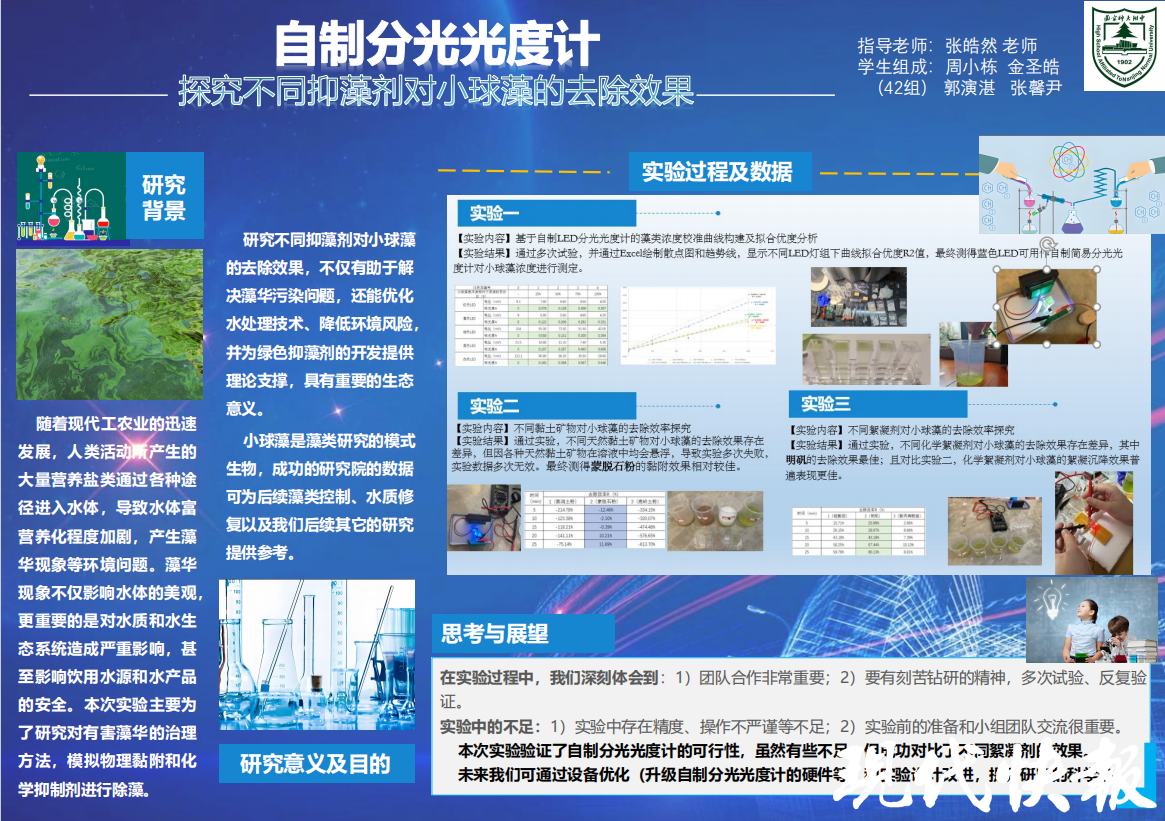 周小栋、金圣皓、郭演湛、张馨尹4名同学跟随张皓然老师的课题研究了不同抑藻剂对小球藻的去除效果,不仅有助于解决藻华污染问题,还能优化水处理技术、降低环境风险,为绿色抑藻剂的开发提供理论支撑,具有重要的生态意义。本次实验让同学们收获颇丰,“我们的实验验证了自制分光光度计的可行性,虽然有些不足,但成功对比了不同絮凝剂的效果。未来我们可通过设备优化,如升级自制分光光度计的硬件等,和实验设计改进,提升研究的科学性。在实验过程中,我们深刻体会到,团队合作的重要性,更要有刻苦钻研的精神,多次试验、反复验证。”