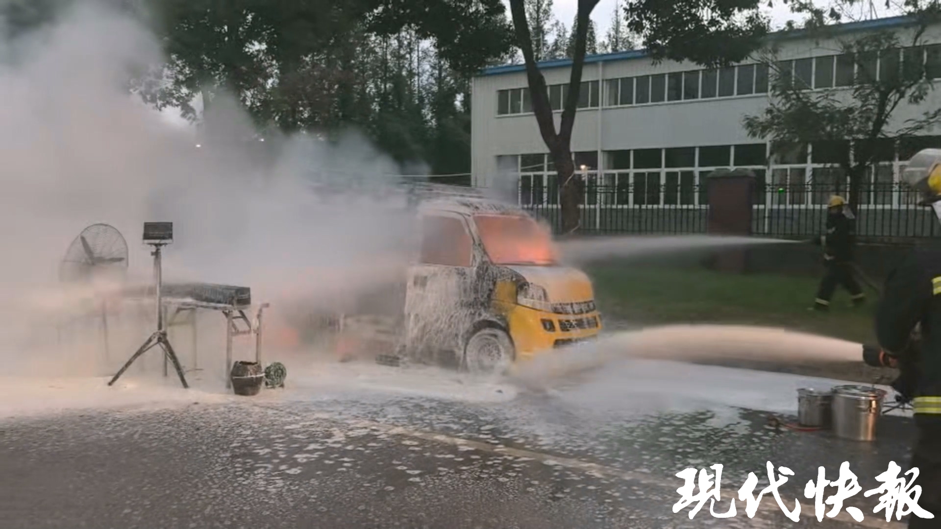 经过扑救,很快控制住车内明火。车主介绍,这辆燃油面包车用于烧烤出摊,在车内安装两组锂电池是给冰柜供电保存食材,不料使用过程中突然起火自燃。
