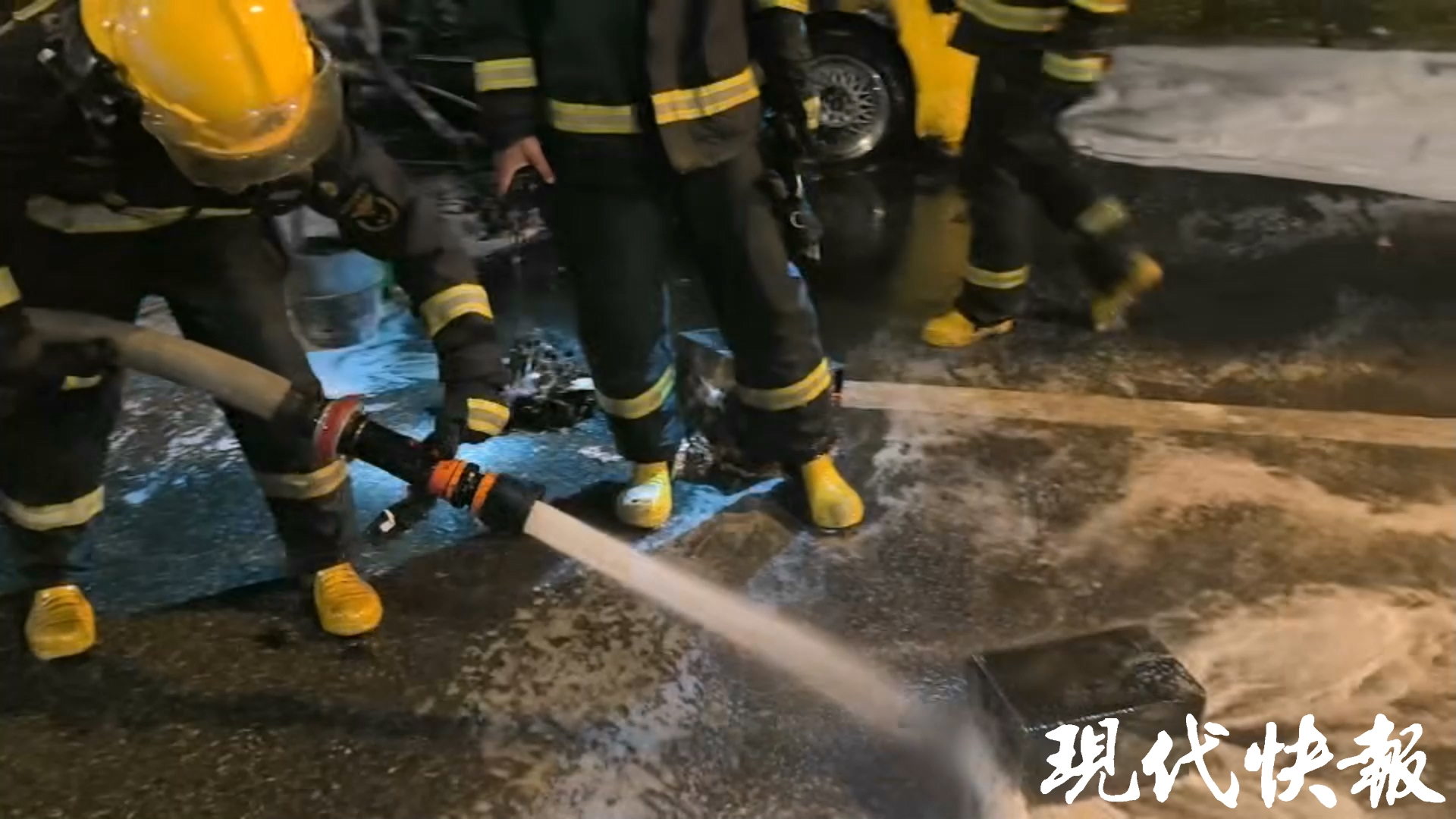 当日下午5时许,消防救援人员赶到现场时,发现面包车正在剧烈燃烧,随时面临爆燃的风险。现场,消防救援人员兵分两路,使用高压水枪对起火部位持续喷射。