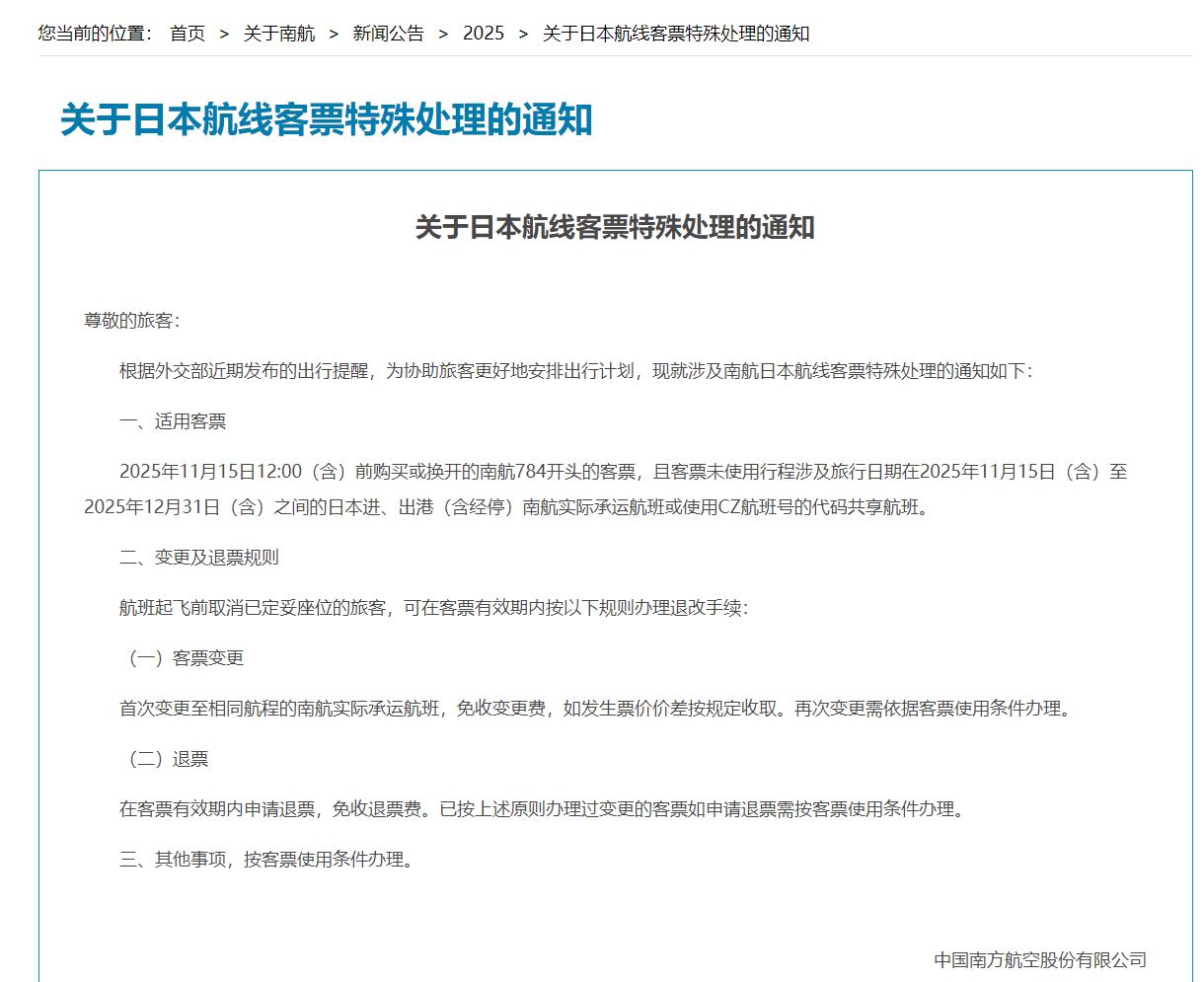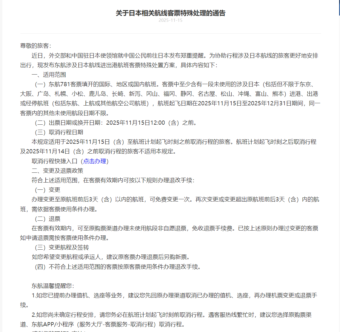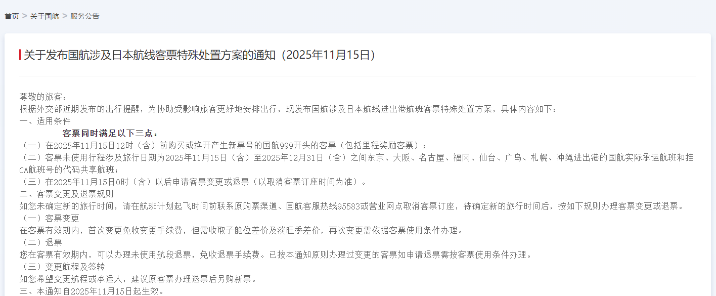 现代快报讯(记者 刘伟娟)近日,外交部和中国驻日本使领馆就中国公民前往日本发布郑重提醒。为协助行程涉及日本航线的旅客更好地安排出行,中国国航、东航、南航相继发布了日本航线客票特殊处理的通知,对于符合条件的客票可以免费退改。具体如下:
