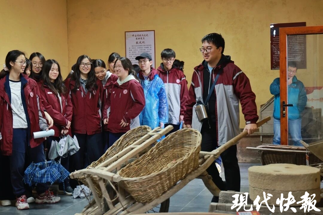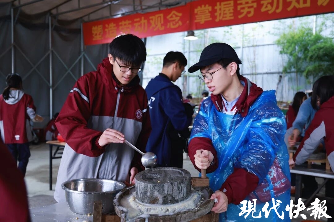 初识农耕环节,同学们参观农具馆,看到播种机、风箱、辘轳、砻时,忍不住上手一试。磨豆浆、制作豆腐脑……午后,同学们围在青石磨旁开启了一场关于豆子的奇妙旅行,添豆、推磨,喝着自己亲手磨的豆浆,品尝亲手做的豆腐脑,满满的幸福感。
