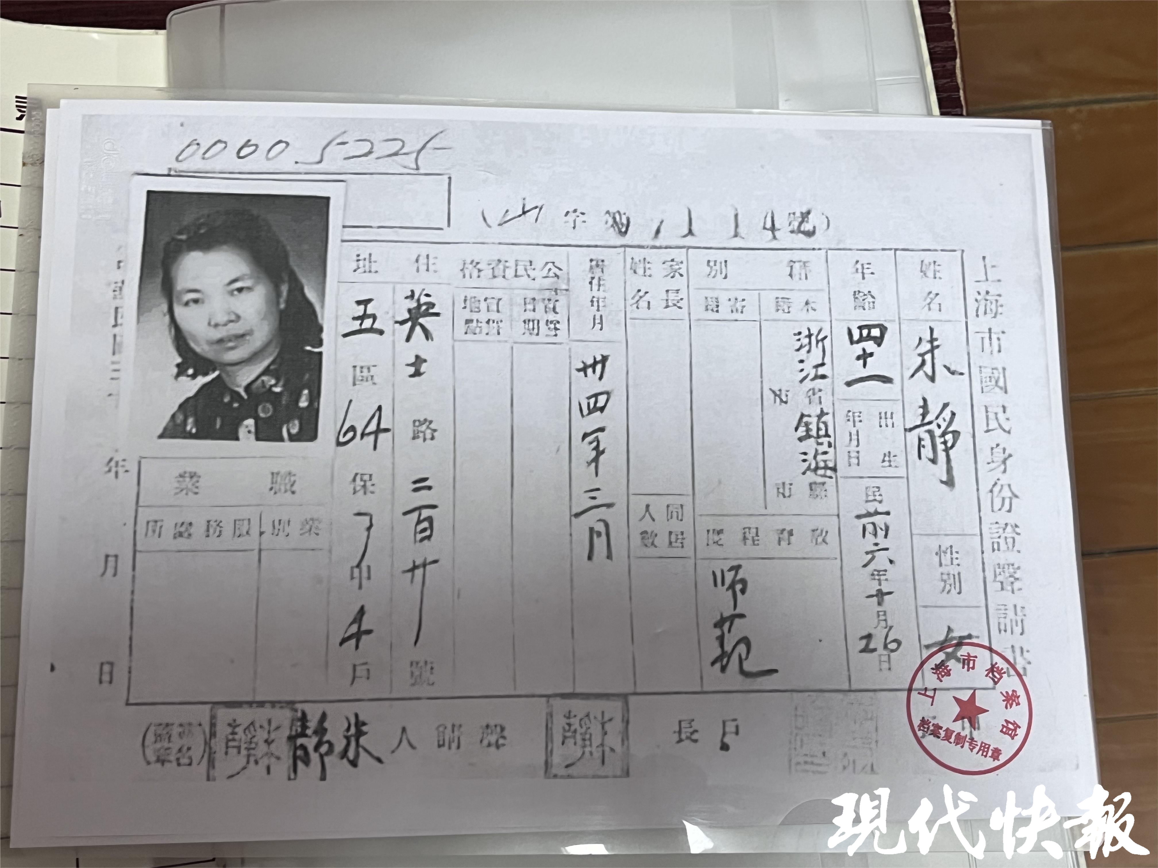 “东海小组”核心成员朱枫长期在上海战斗生活,南京市档案馆在获悉上海市档案馆馆藏朱枫相关户籍档案资料的消息后,与上海市档案馆积极沟通,获得了朱枫的两份“上海市国民身份证声请书”影印资料。