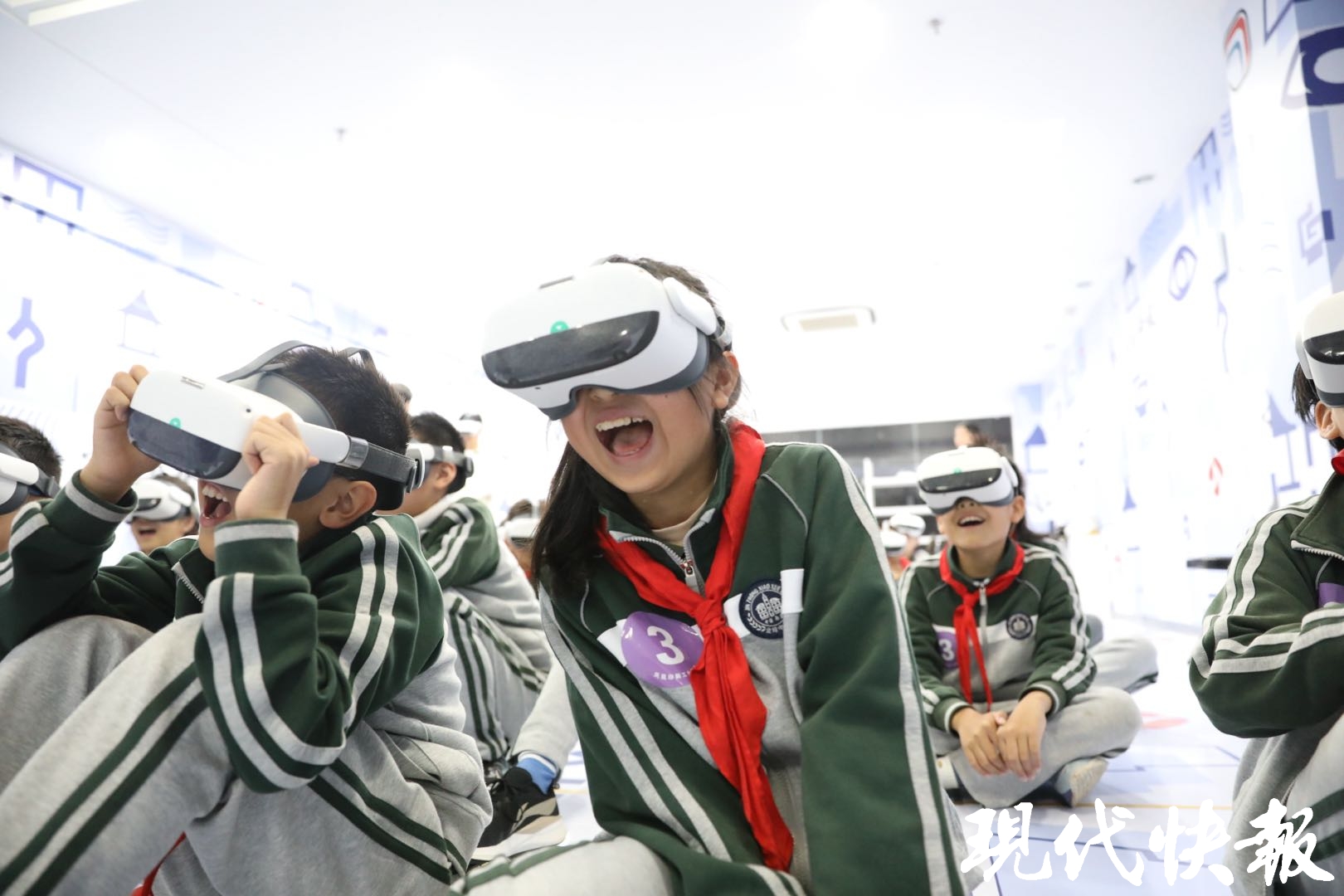 在沉浸式体验场馆,孩子们戴上VR眼镜,与孟子、苏轼展开了一段跨越时空的对话。“一年好景君须记,最是橙黄橘绿时”“富贵不能淫,贫贱不能移”……在这个汉字空间,六(9)班的颜悦泽看到了中国的壮丽山河。她激动地说:“太神奇!太壮观了!”