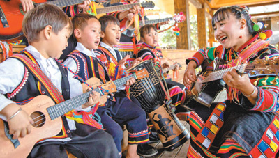 老达保村中的“百灵鸟”李娜倮与孩子们一同弹奏吉他,感受音乐带来的欢乐与幸福。