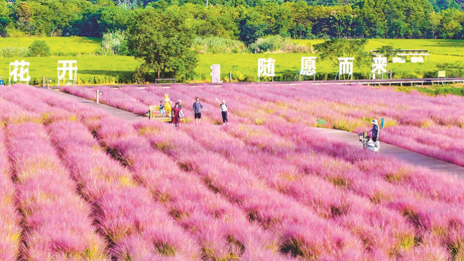 10月5日,南京市溧水区郭兴庄园景区百亩粉黛乱子草盛开,吸引众多游客前来打卡。 朱红生 摄 (视觉江苏网供图)