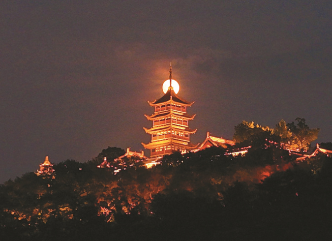 10月6日晚,一轮满月与南通狼山国家森林公园支云塔交相辉映。 许丛军 摄