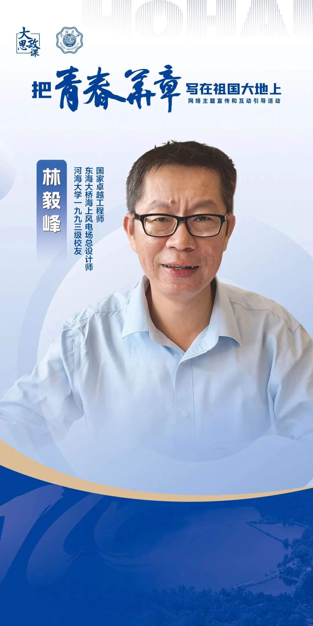 林毅峰工程师:“大学是青春的蓄水池,深度就决定了你的人生的航程”。作为东海大桥海上风电场总设计师,他曾在河海大学数过星星、寻过六朝古迹,如今带领团队用“八爪鱼”与“不倒翁”技术,让中国海上风电领跑全球。