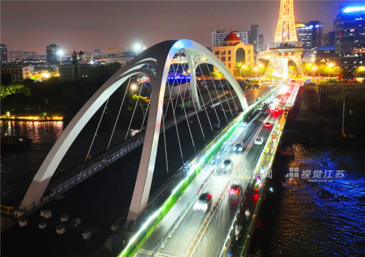 10月11日,苏州市吴中区长桥改建项目顺利完成西半幅钢箱系杆拱钢梁及超薄高韧沥青罩面施工作业并亮灯。西半幅通车后将转为东半幅钢箱系杆拱钢梁施工作业。王建中 摄 视觉江苏网供图