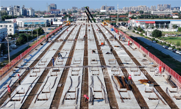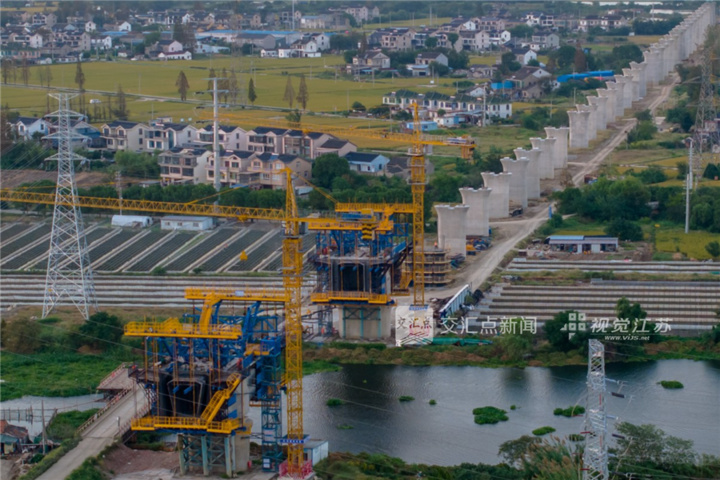 10月10日,通苏嘉甬铁路站房与正线同步推进。当前项目建设进入关键阶段,已转入桥梁上部结构施工阶段。黄佳 摄 视觉江苏网供图