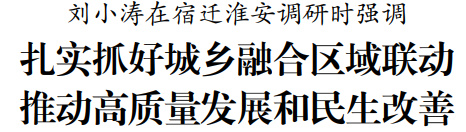 交汇点讯 11月15日至16日,省长刘小涛在宿迁市、淮安市调研。他强调,要深入学习贯彻党的二十届四中全会和习近平总书记对江苏工作重要讲话精神,完整准确全面贯彻新发展理念,发挥比较优势、坚持各扬所长,做好区域互补、跨江融合、南北联动大文章,扎实推进乡村全面振兴,促进城乡融合发展、区域协调发展,让现代化建设成果更多更公平惠及广大群众。
