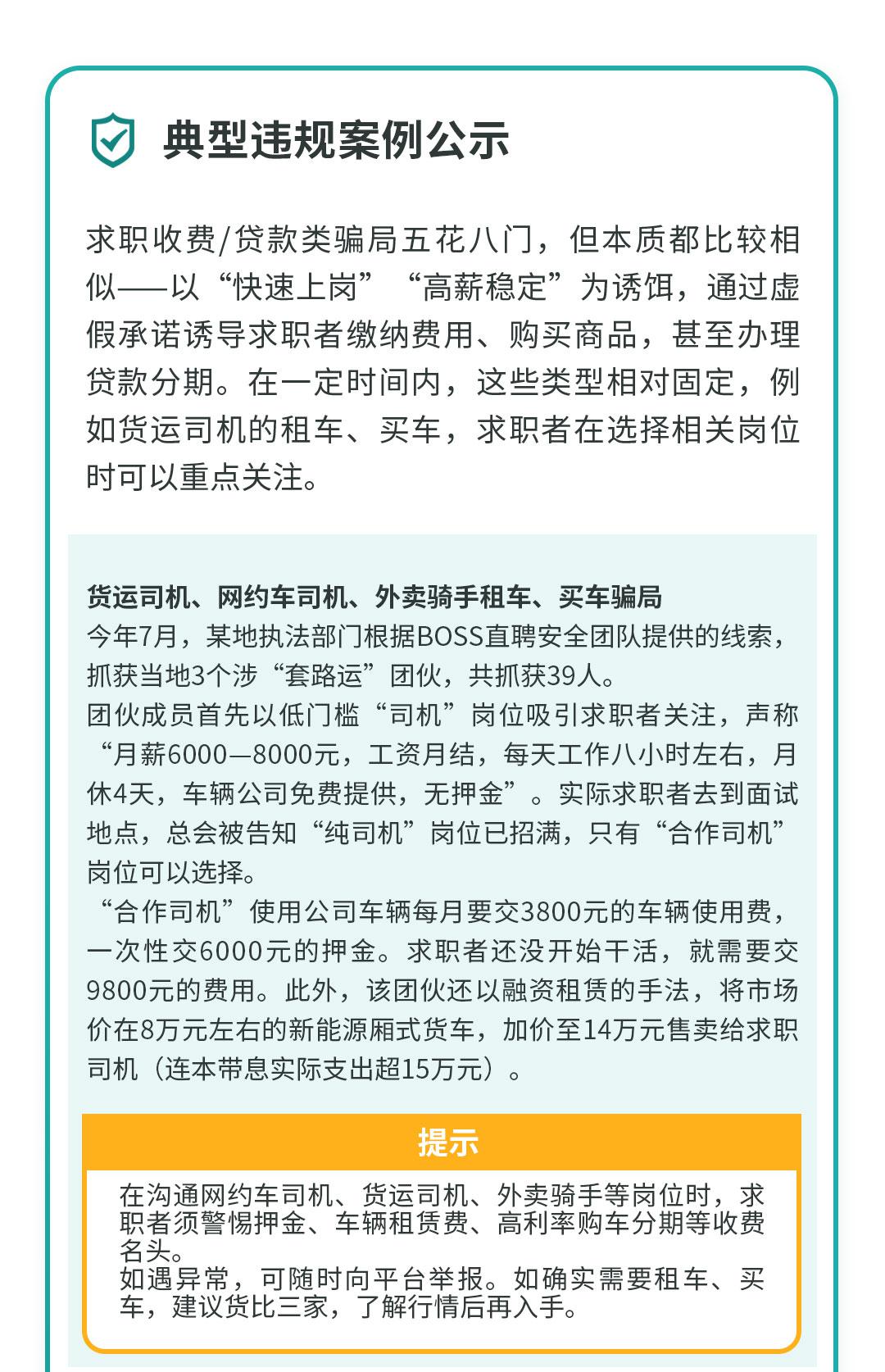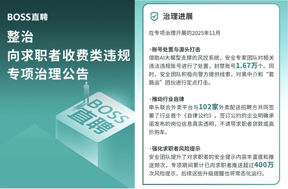 同时,BOSS直聘重点打击货运司机、网约车司机、外卖骑手租车、买车,培训招生收费贷款,模卡与形象包装收费等典型违规违法行为,2025年11月共处置涉收费类违规违法账号1.67万个。安全团队积极向警方提供线索,对黑中介和“套路运”团伙进行定点打击。