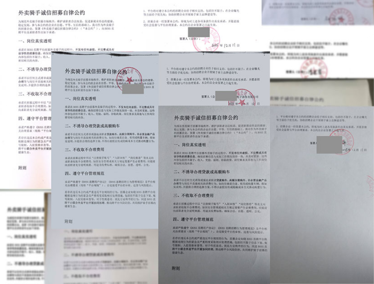 在此基础上,近期BOSS直聘联合外卖平台与102家外卖配送企业共同签署了《外卖骑手诚信招募自律公约》(以下简称《公约》)。这是外卖配送招聘企业首个以“诚信”为核心的行业自律公约。公约重点包括岗位真实透明、不诱导贷款购车、不收取不合理费用、遵守平台管理规范等方面。
