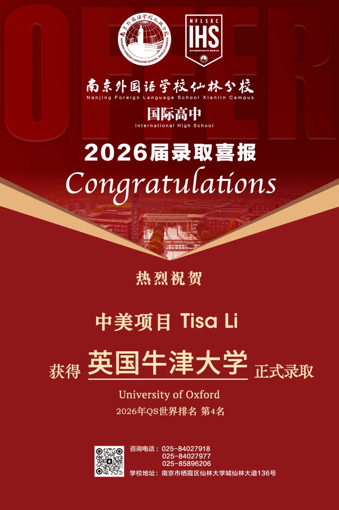 近日,英国牛津大学2026年预录取榜单揭晓,国内有超过200名学生收获offer。南京地区共有7名学生上榜,分别来自南京外国语学校、南京市金陵中学、南京仙林外国语学校等。来自南京仙林外国语学校国际高中中美项目的李红衣同学,成功获得了牛津大学实验心理学专业的正式录取。在普遍认知中,申请英国名校往往需要依托A-Level课程体系,而李红衣所在的却是中美项目。她是如何实现跨体系申请突破的呢?