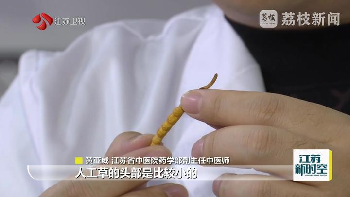 江苏省中医院药学部副主任中医师黄亚威说:“人工草的头部是比较小的,相比身子来说是小的;从头到身子,明显感觉身子是突然膨大的。野生虫草四对足很明显往上翘,这是很明显的一处表面特征。”