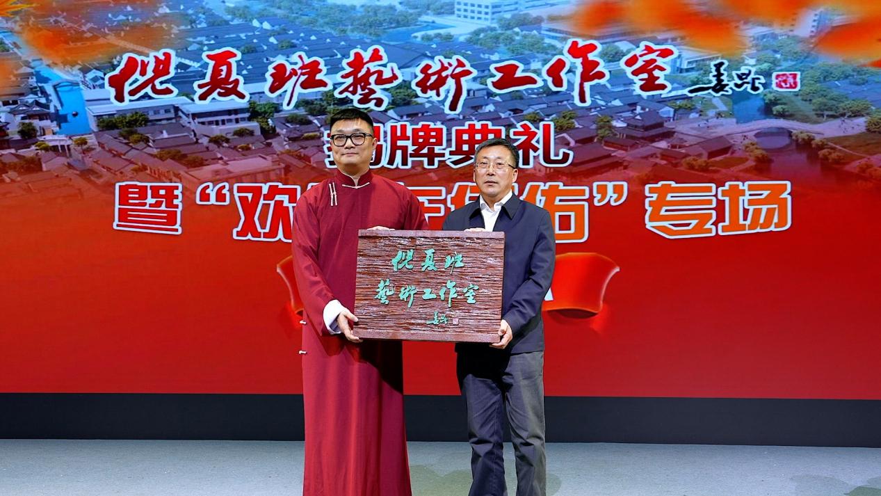 在所有人的注视下,盐城文学院院长蒋东仁和南京群星相声艺术团团长、倪夏班班主倪夏宇共同揭牌,由著名相声表演艺术家姜昆先生题写的“倪夏班艺术工作室”牌匾上的几个大字金光闪闪、引人注目。用倪夏宇的话来说:“师爷姜昆先生题写的不仅是字,更是老一辈艺术家对我们后辈的殷切期望,更是曲艺事业薪火相传的象征。”