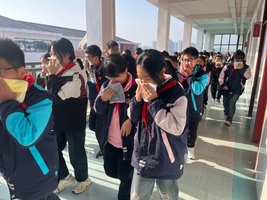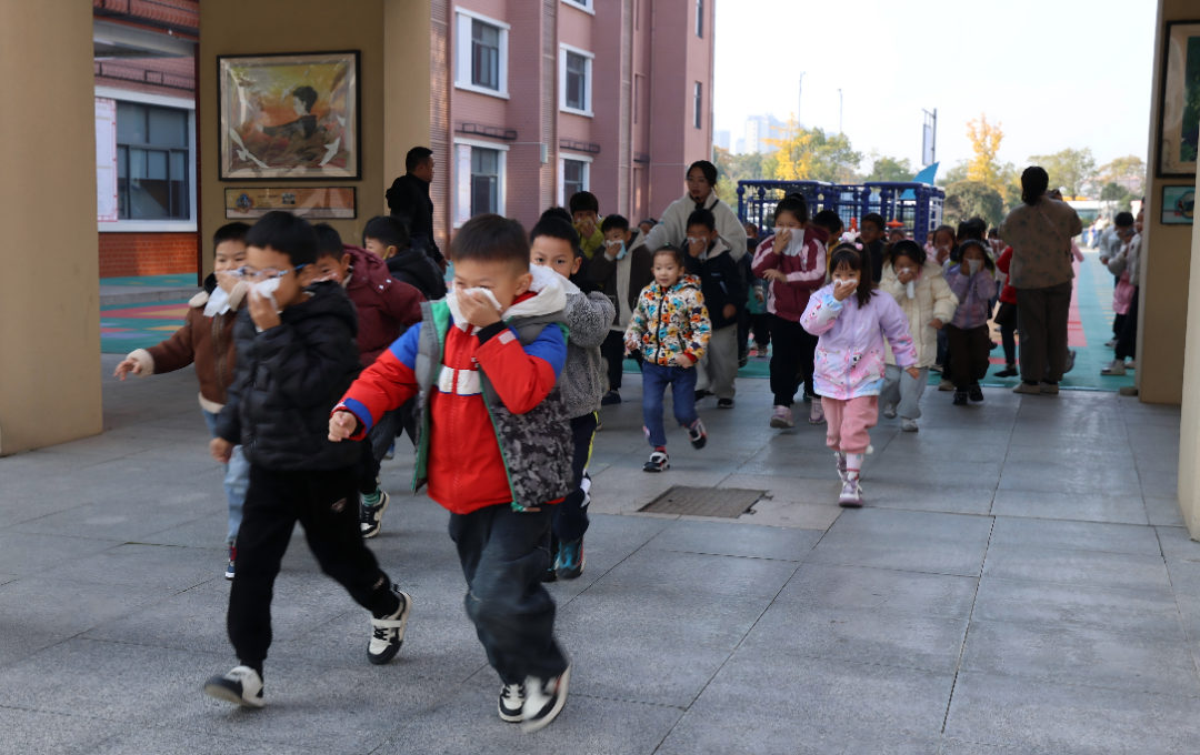 上午9点20分,消防疏散警报声准时响起,全校师生立即进入应急状态,各楼层负责教师迅速到位,引导学生有序撤离。在疏散过程中,学生们迅速利用毛巾、纸巾、湿巾等物品捂住口鼻,在老师的带领下弯腰前行,沿着教室两侧的安全路线快步走向走廊。楼梯间里,学生们遵守秩序,不争不抢、依次下行,跑向安全区域。整个过程,全体师生紧密配合、相互协作,按照预定计划进行,安全到达指定集合地点。