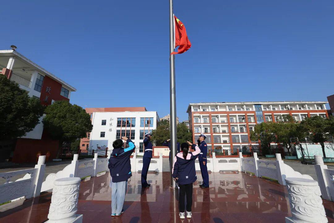 升旗仪式在疏散演练结束后正式开始,全体师生整齐列队,神情肃穆,目光紧紧跟随着国旗。本次升旗邀请区消防大队官兵参与,一名官兵手握国旗,另外两名官兵分立两侧护旗,步伐坚定有力地迈向旗杆。伴随着雄壮国歌,五星红旗渐渐飘扬高空,与官兵挺拔的身影在晨曦中交相辉映,令现场师生对安全的敬意更加深沉。