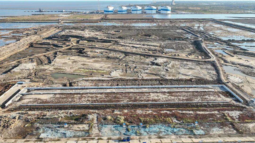 连日来,在滨海港主港池北区通用码头三期工程施工现场,施工人员各司其职、干劲十足,各类机械设备有序运转,一派热火朝天的建设景象。
