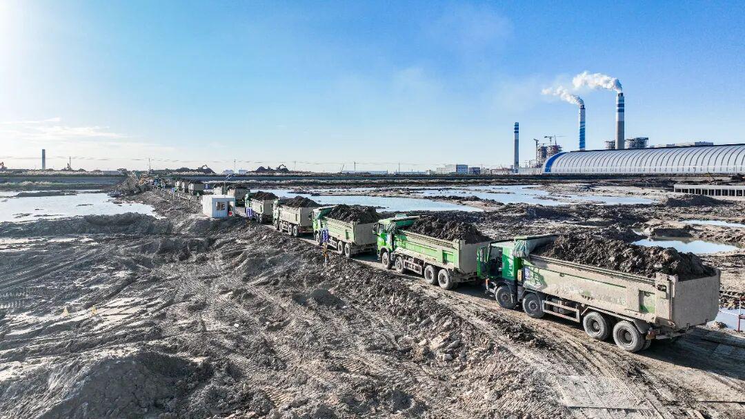 在码头前沿的陆上开挖区域,多台挖掘机、运输车往来穿梭,不停地将土方转运至指定位置,铁臂挥舞间奏响建设强音。