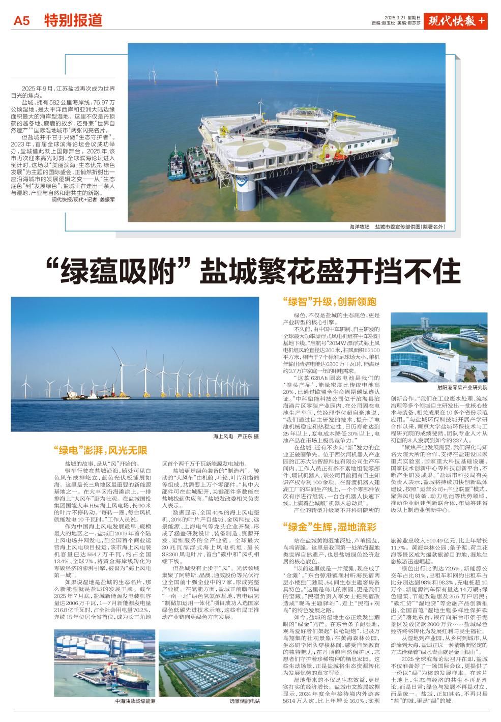 日子开始了。2025年9月21日的《现代快报+》率先以整版的篇幅,以“绿蕴吸附”这个生动形象的比喻深度报道了盐城在生态优先,绿色发展方面走出的一条人与湿地、产业与自然和谐共生的发展新路。从“‘绿电’澎湃,风光无限、‘绿智’升级,创新领跑、‘绿金’生辉,湿地流彩”三方面展示了蓬勃发展中的盐城。盐城为一场国际会议,提供了一个以绿为核的发展样本,在这片土地上绿色与经济的共生不再是理想而成为日常。《现代快报+》坚信,盐城繁花盛开是挡不住的。在这样的阅读中,我的灵魂得到了滋养。