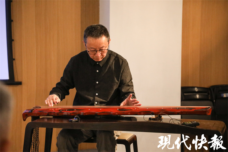 最后,郭平为大家现场弹奏了《流水》《阳关三叠》两首琴曲。在《古琴丛谈·弹琴的讲究》中,郭平写道:“弹琴要择地择境,其实还是对心境、对自己的要求。如果心思清静平和,再喧嚣的地方,依然可以心无旁骛地弹琴。”他是这样写的,也是这样做的,循着琴声,在场读者如入无人之境,去到了“清流激湍”、登上了“崇山峻岭”,体会到“渭城朝雨浥轻尘,客舍青青柳色新。劝君更尽一杯酒,西出阳关无故人”的况味。