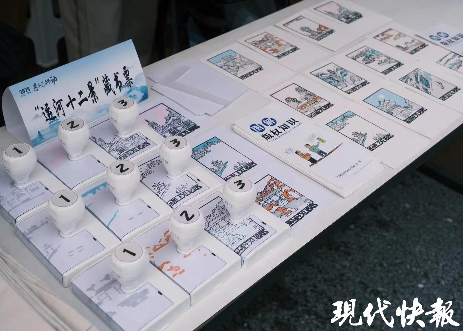 雨伞、扑克牌、钥匙包……各种各样的文创产品,覆盖了衣食住行各方面。其中,有一套“运河十二景”藏书票格外吸引眼球。这套藏书票采用传统的经折装形式,既别致典雅,画风又很时尚,对扬州的运河风情进行了高度浓缩。