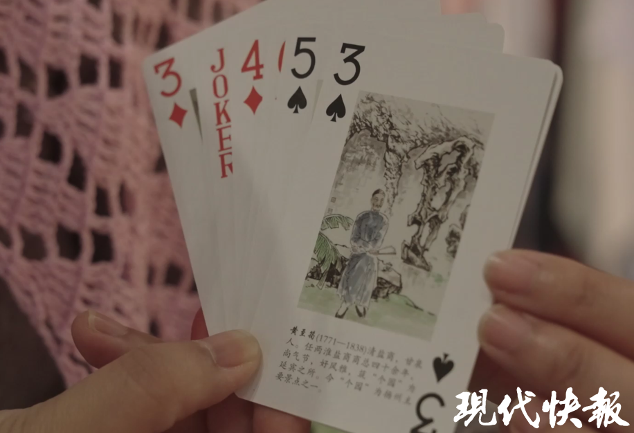 在吴晓娴的帮助和促成下,庞现青将108张画作注册了版权,但原画作尺寸很大,且每一幅都需要装裱。怎么才能让更多人看到这套《扬州历代名贤像赞》呢?吴晓娴联想到,108张,正好是两套扑克牌的数量。于是,便有了这套掼蛋卡牌的诞生。通过小小一个木盒子,便能全览扬州108位名人的故事。
