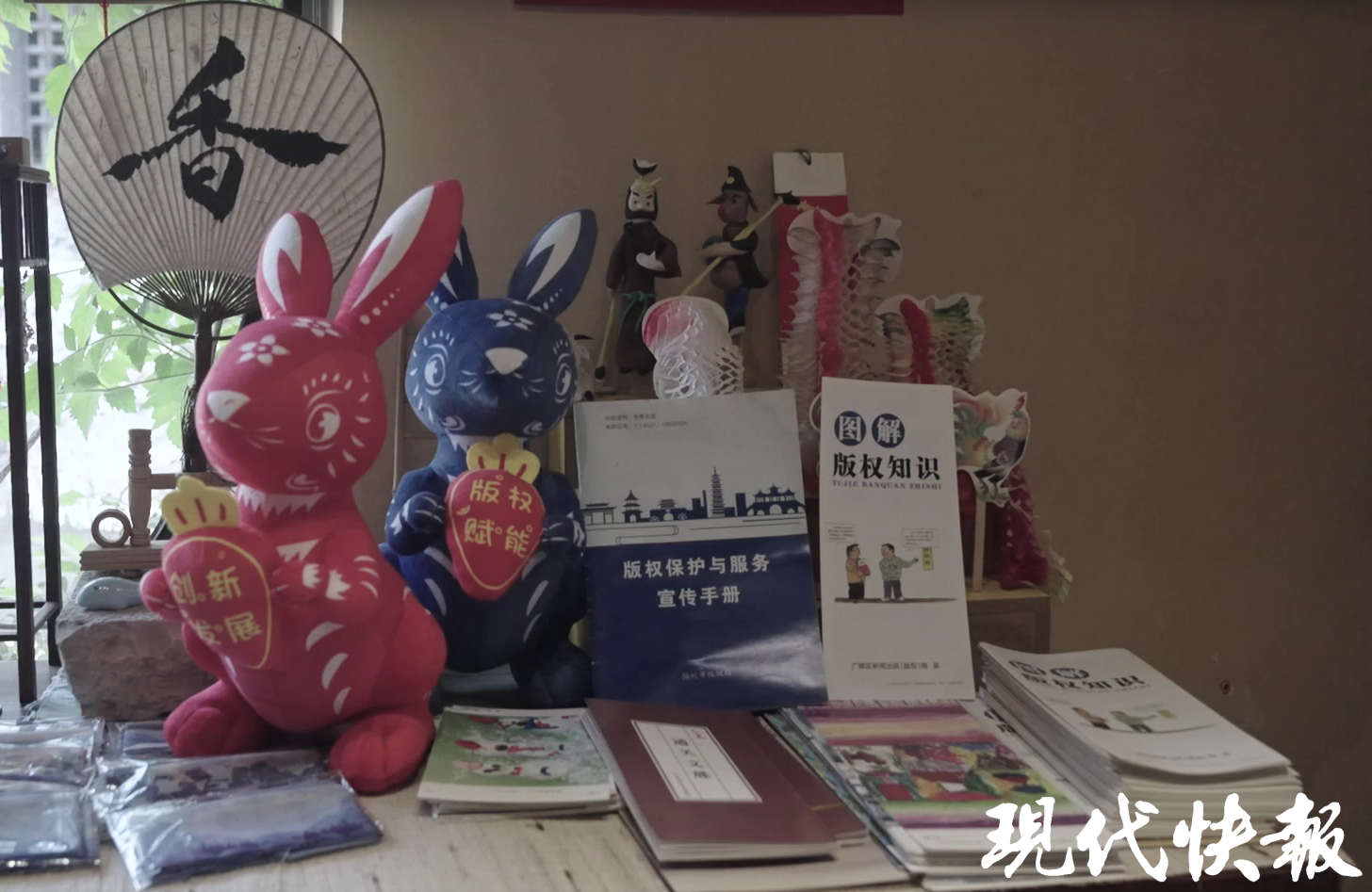 “彡寻民艺”文化空间也是仁丰里版权工作站的所在地。墙上挂着宣传版权的标语、桌上放着《图解版权知识》宣传手册、印有“版”字的帆布袋……走进“彡寻民艺”文化空间,处处都能看见版权的元素。此外,吴晓娴还时常会组织街区的艺术家们,开展版权保护讲座,让更多人了解版权的重要性。
