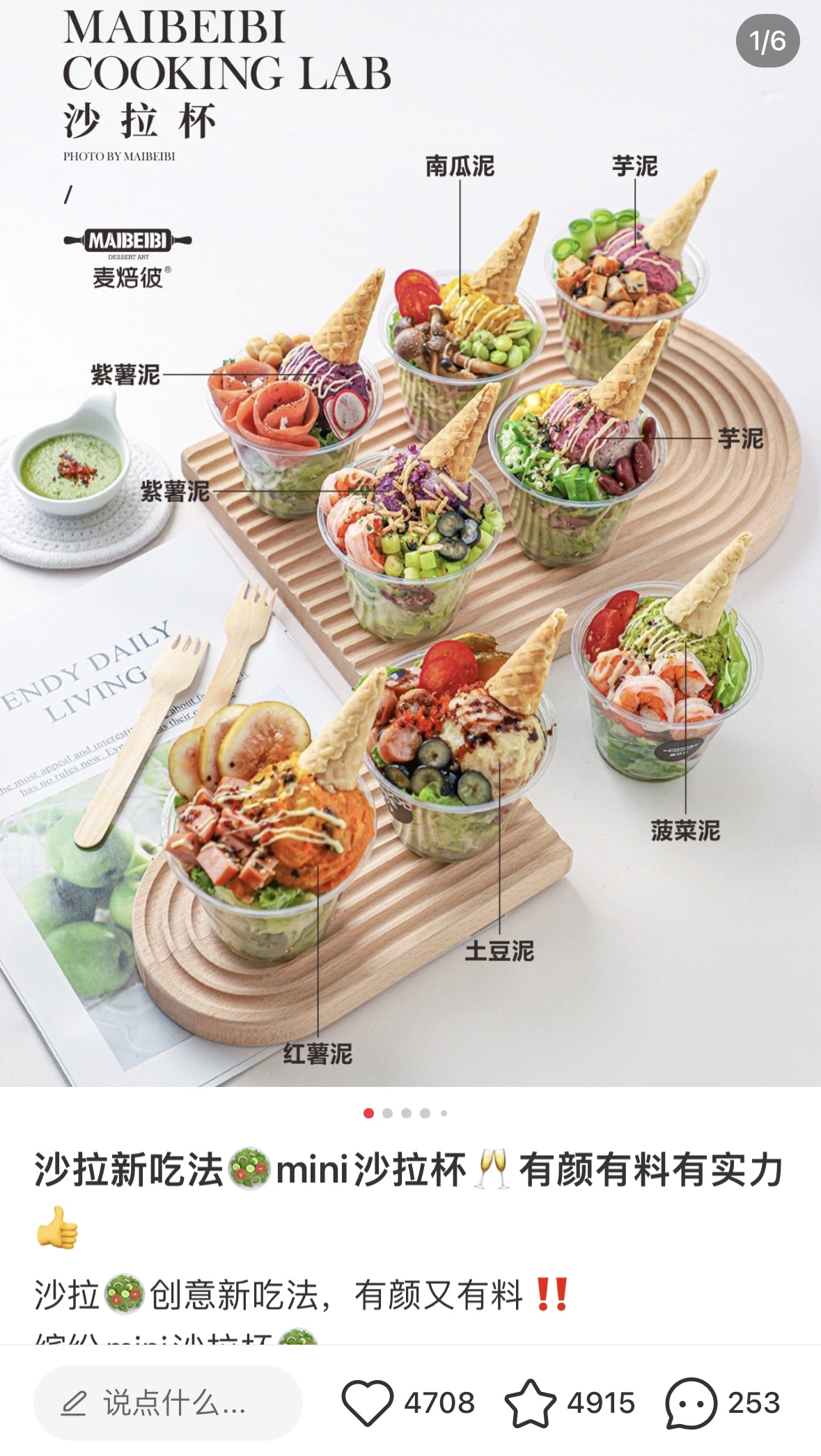 在某社交平台上,“轻食mini沙拉杯”十分受欢迎。一篇标题为《沙拉新吃法,有颜有料有实力》的笔记在平台上收获了近5000点赞,共有4000多人收藏。图片中每个沙拉杯均以蔬菜、水果打底,表面装饰上肉粒,将南瓜、紫薯等打成泥挖成球置于表面,再放上一个迷你脆筒,颜色缤纷造型独特,受到不少网友欢迎。