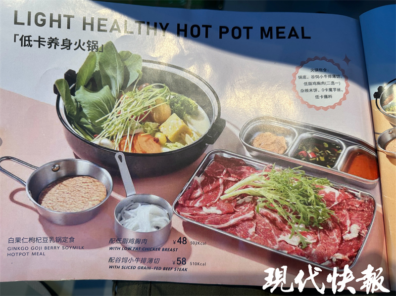“店内订单量一直都不少,天热之后很多客人有减脂的需求,客流量增加了一些。”店员告诉记者,店内热销的轻食火锅,是没有外卖的,只能来店里食用。记者注意到,正值午餐时间,店内几乎没有空位,半数以上的客人桌上放着轻食火锅。店内共有5种不同口味的轻食火锅,售价在36元至70元之间,在菜单上根据套餐内涮肉品种的不同,标有对应的热量。
