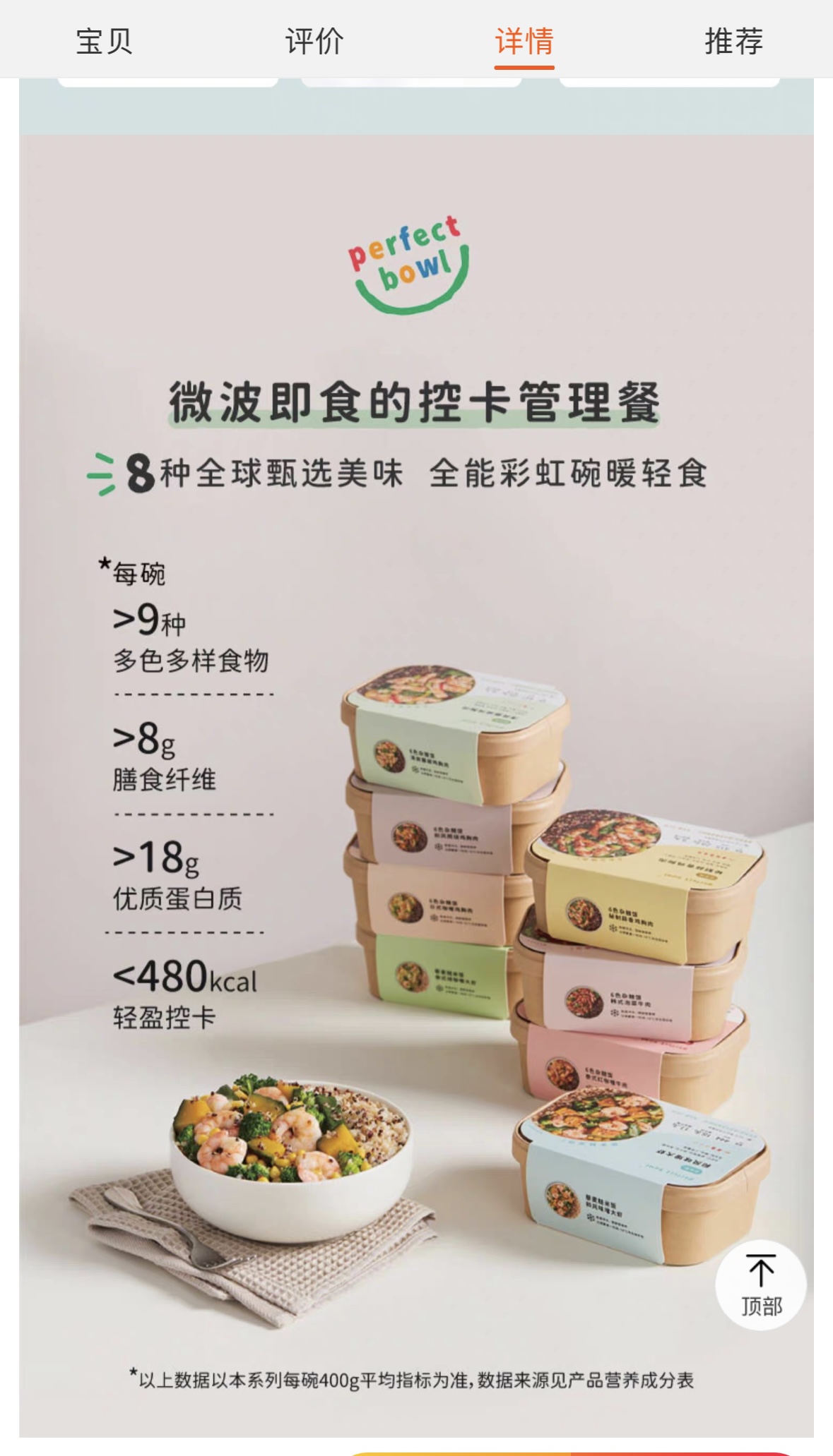 记者在某购物网站上搜索发现,不少商家推出了轻食预制菜。其中一款“微波即食轻食套餐”,共有8种不同口味,单份价格在30元至40元之间,月销量为2000+。在商品详情页中,商家宣传其为“微波即食的控卡管理餐”,并在下方标注每碗卡路里小于480kcal。从图片上看,与线下店中售卖的轻食套餐并无差别。记者在该商品评论区发现有不少上班族购买,有人表示其低卡又美味、方便又卫生,也有人觉得好吃但性价比一般。