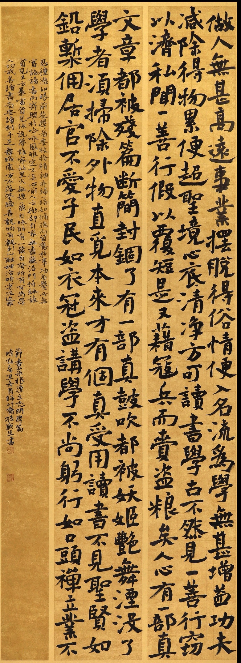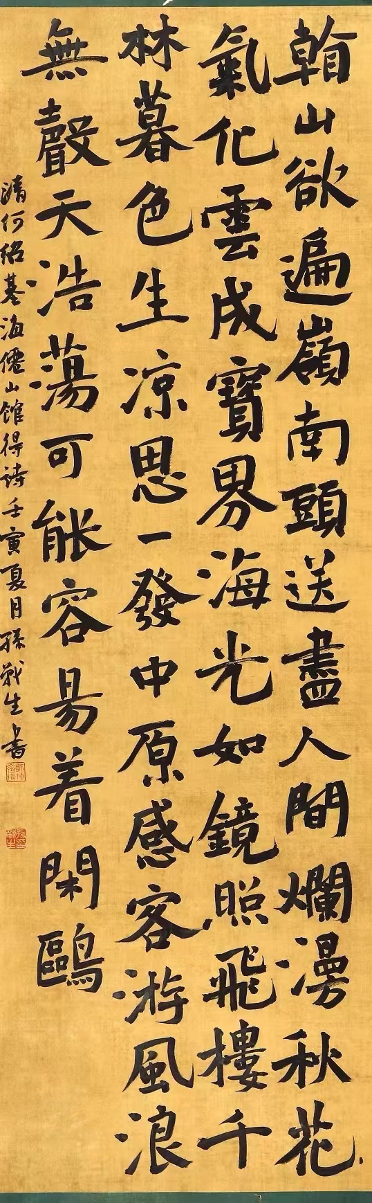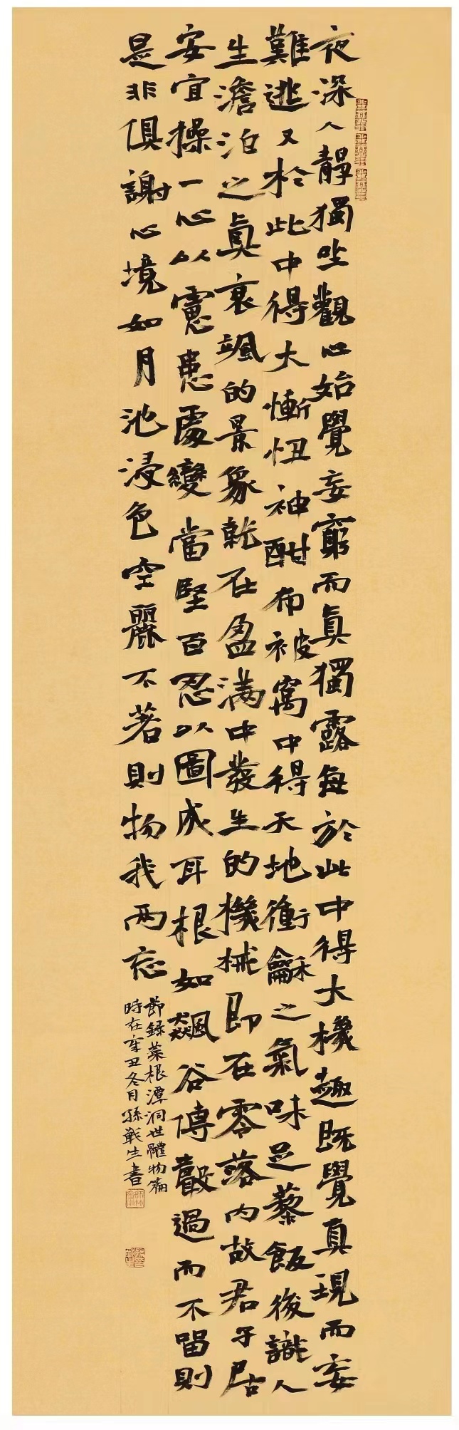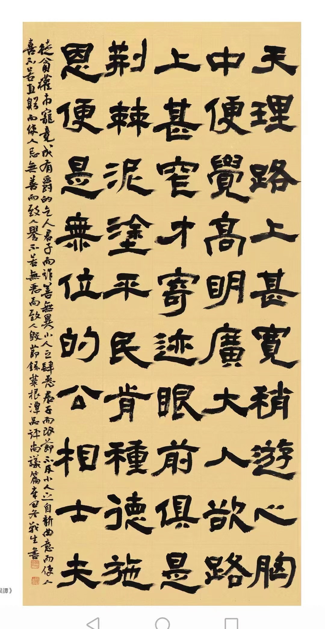 孙战生对古人经典书法技法心摹手追,深度锤炼,恰恰就是对这一命题的一个极好注解。他以古人精微多变的笔法和结体节度其手,以古人高古浑穆的精神气象为审美追求,以自身豪放豁达的人生态度为情感依托,并注重文史哲等相关学问的修炼。以此主攻隶书,旁通诸体,这就为进一步建立自己的一套艺术表现语言打下了良好的基础,也有了思想认识上的保障。书法到一定境界,就绝不只是一个表面化的单纯的书写行为,而是一个人综合修养的真实反映。优秀的作品都蕴含着书法家的人格品位,当一个人能够把学识、品格和对现实人生的感悟自然融合于书法作品当中的时候,他的书法才会真正取得丰硕的成果。