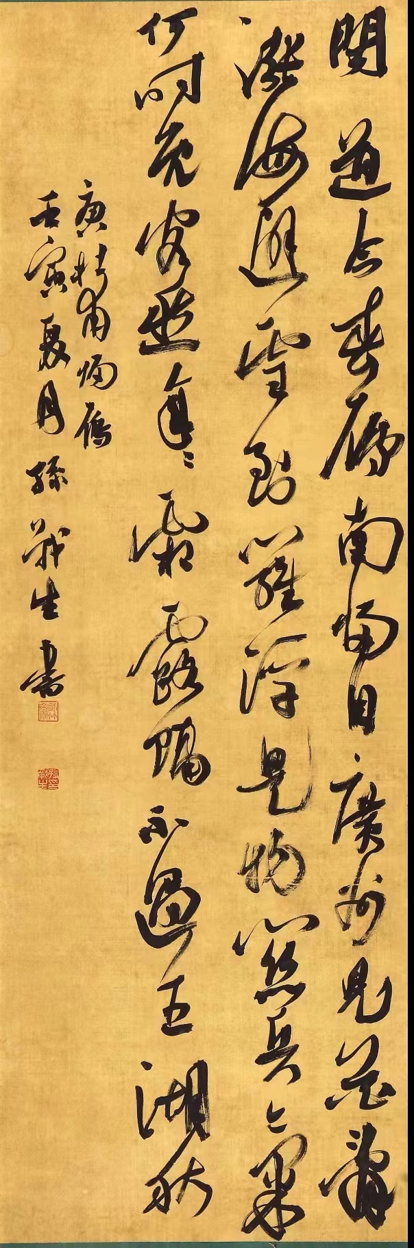 我与书家孙战生两人不在一个城市,我住在市区,他住在宝丰县。相识于一个偶然,初识是在另外一个朋友相邀的聚会上,我与书家孙战生当时都受邀在场,亲眼见到了温文尔雅的孙战生饮酒、品茶、题字、作画,玩得开心,是个性情中人,这让人在不时的捧腹会心之间顿生亲切,特别是那低沉的嗓音,让你很容易就能走进他的叙事状态。