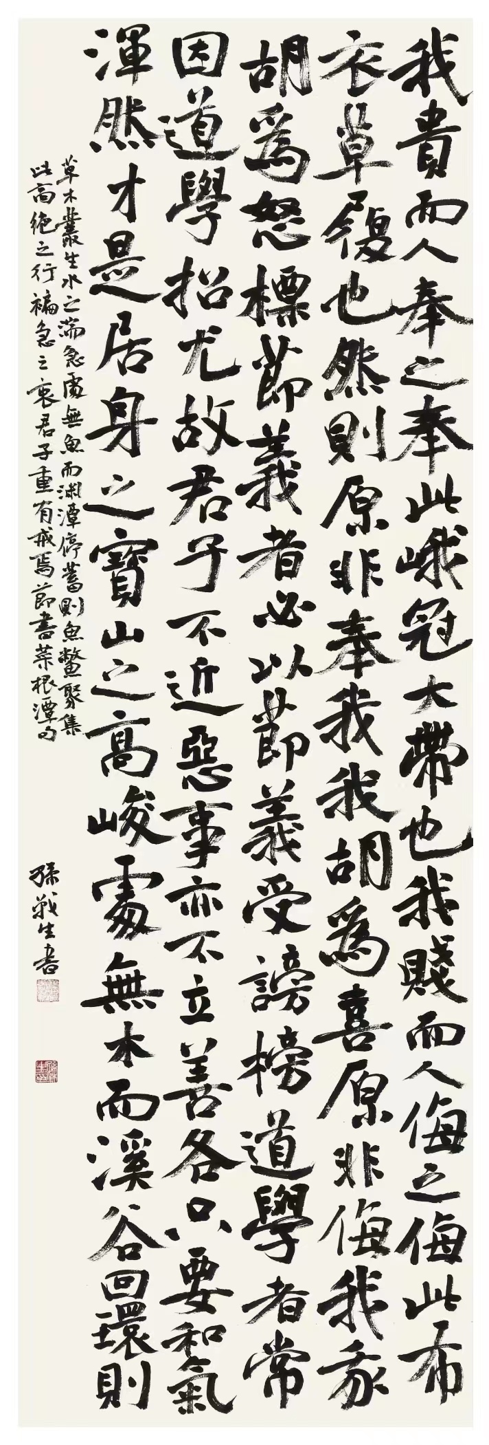 一个优秀的书法家既要继承中国古代士大夫修齐平治、先忧后乐的文化基因,这样的书法家才会有担当精神和文化自觉,才不会削弱对前人的继承。孙战生有自己的精神家园,也有对中国传统文化精神实质的理解及对时风的慨叹。与他聊天你会发现,他不是个激烈的人,很祥和,即使对一些问题有不同看法时,他也始终不离中和之态度。