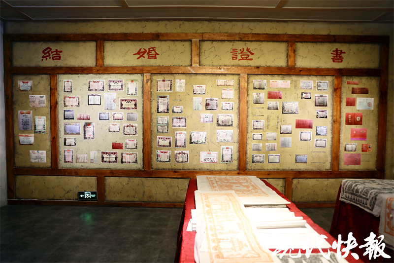 值得一提的是,馆内有一整面墙上展陈从明清、民国到现代不同时期不同地方的“结婚证”。
