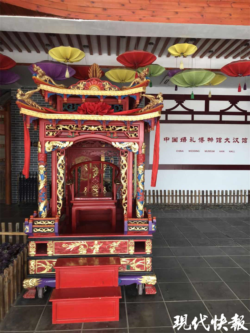 提到明媒正娶,花轿必不可少。博物馆里有两顶花轿格外醒目,一顶是织锦刺绣,周边镶嵌禾穗,典雅大方;另一顶是梨花木工艺,尽显辉煌蓬勃之感。
