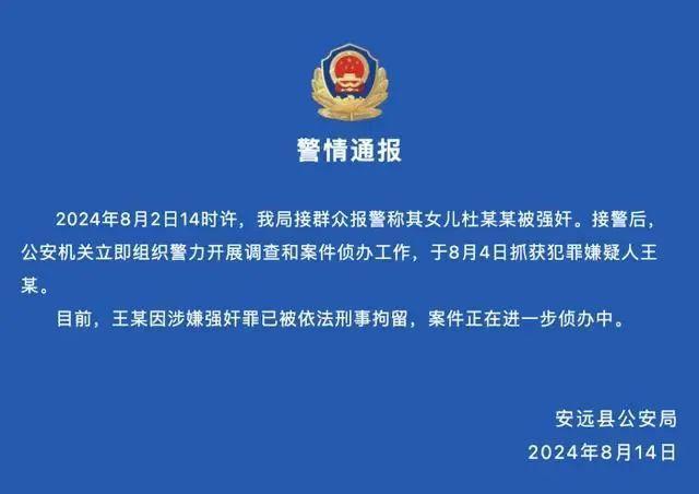 8月14日,江西安远警方发布通报,称该局于8月2日14时许,接到群众报警称其女儿杜某某被强奸。8月4日,犯罪嫌疑人王某已被抓获并依法刑事拘留。根据此前报道,杜某某参加训练营时疑遭负责人侵犯,并在警方立案第二日从6楼坠亡。现代快报记者多方求证发现,杜某某生前参加训练营的机构正是江西安远县“伍兵特训营”,这究竟是一家什么样的训练营?