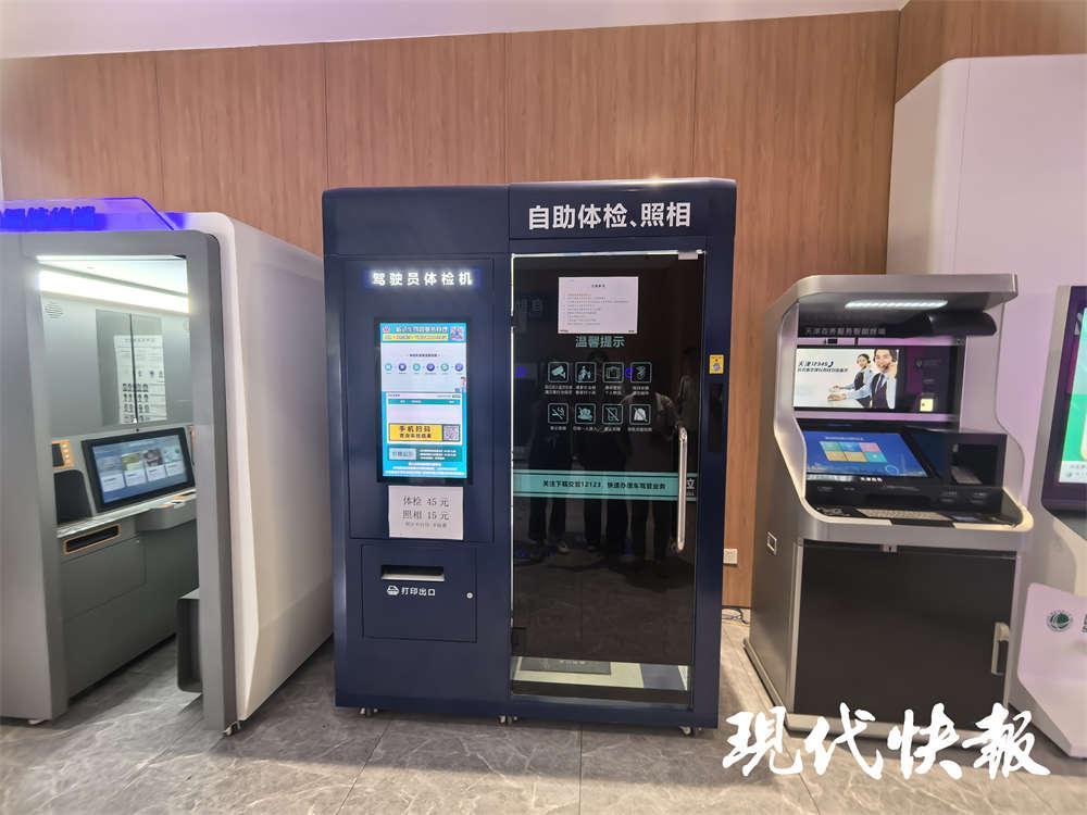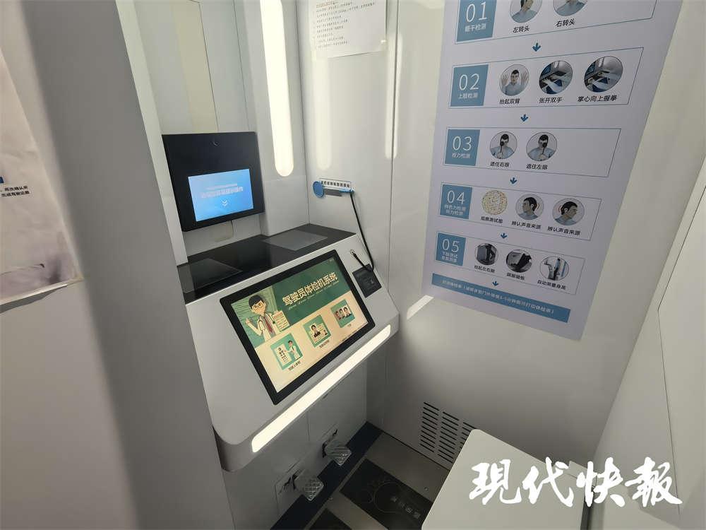 现代快报讯(记者 徐红艳 文/摄 于茜同/后期)刷一下身份证,然后跟着屏幕提示进行视力矫正、声音检测、肢体检测、自动测量身高……完成这些操作后,等待三五分钟就可以拿到结果。驾驶证到期了不用跑很远排队体检,在一台驾驶员体检机内就能完成。