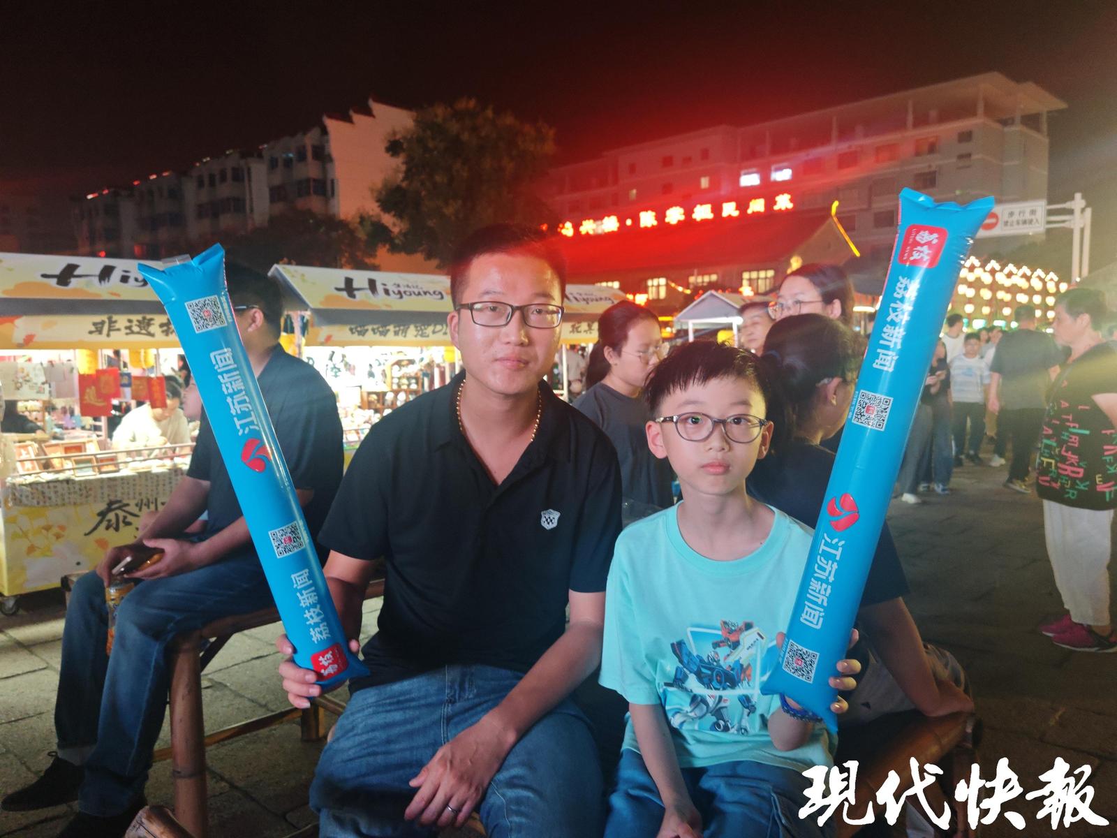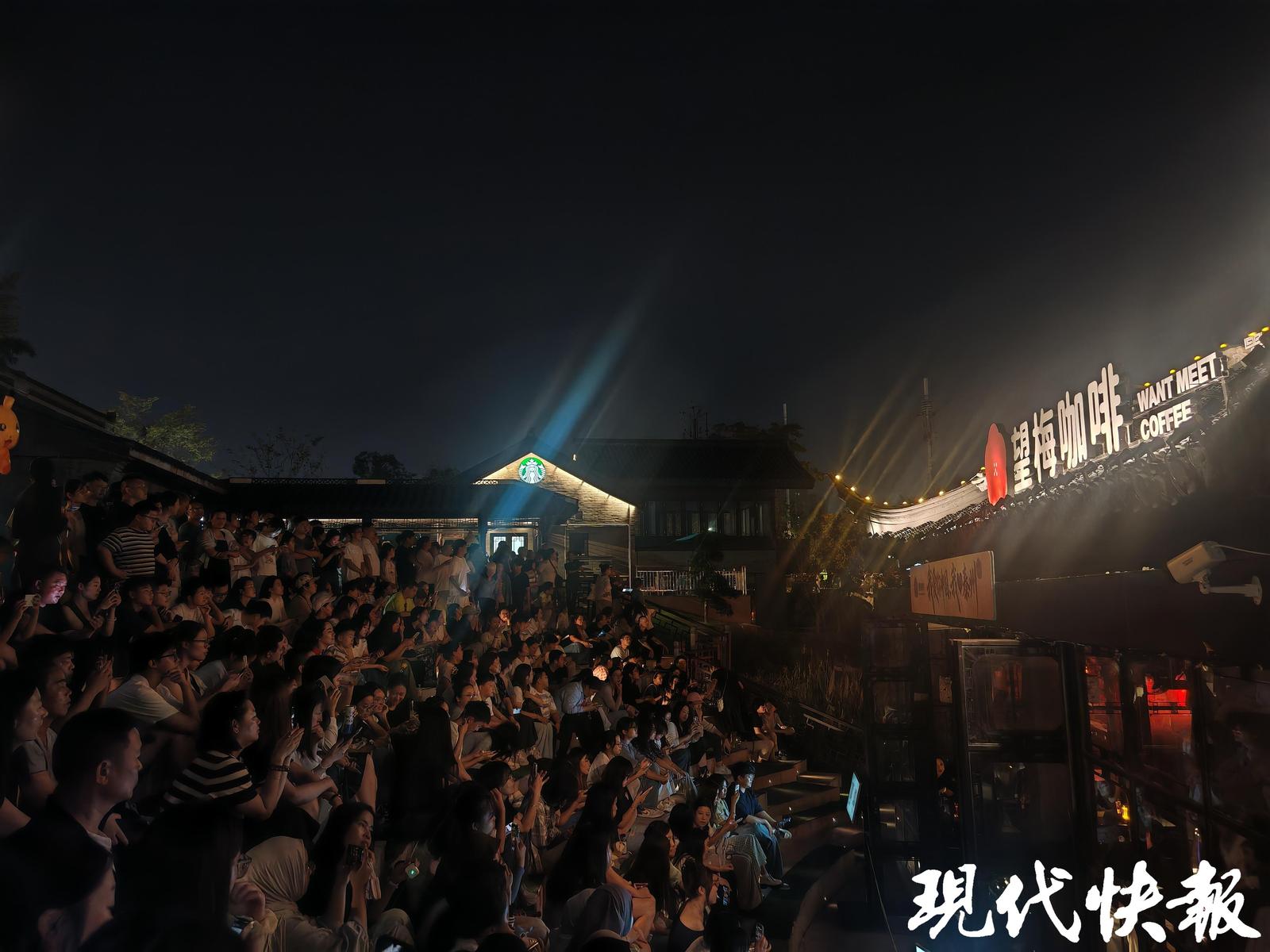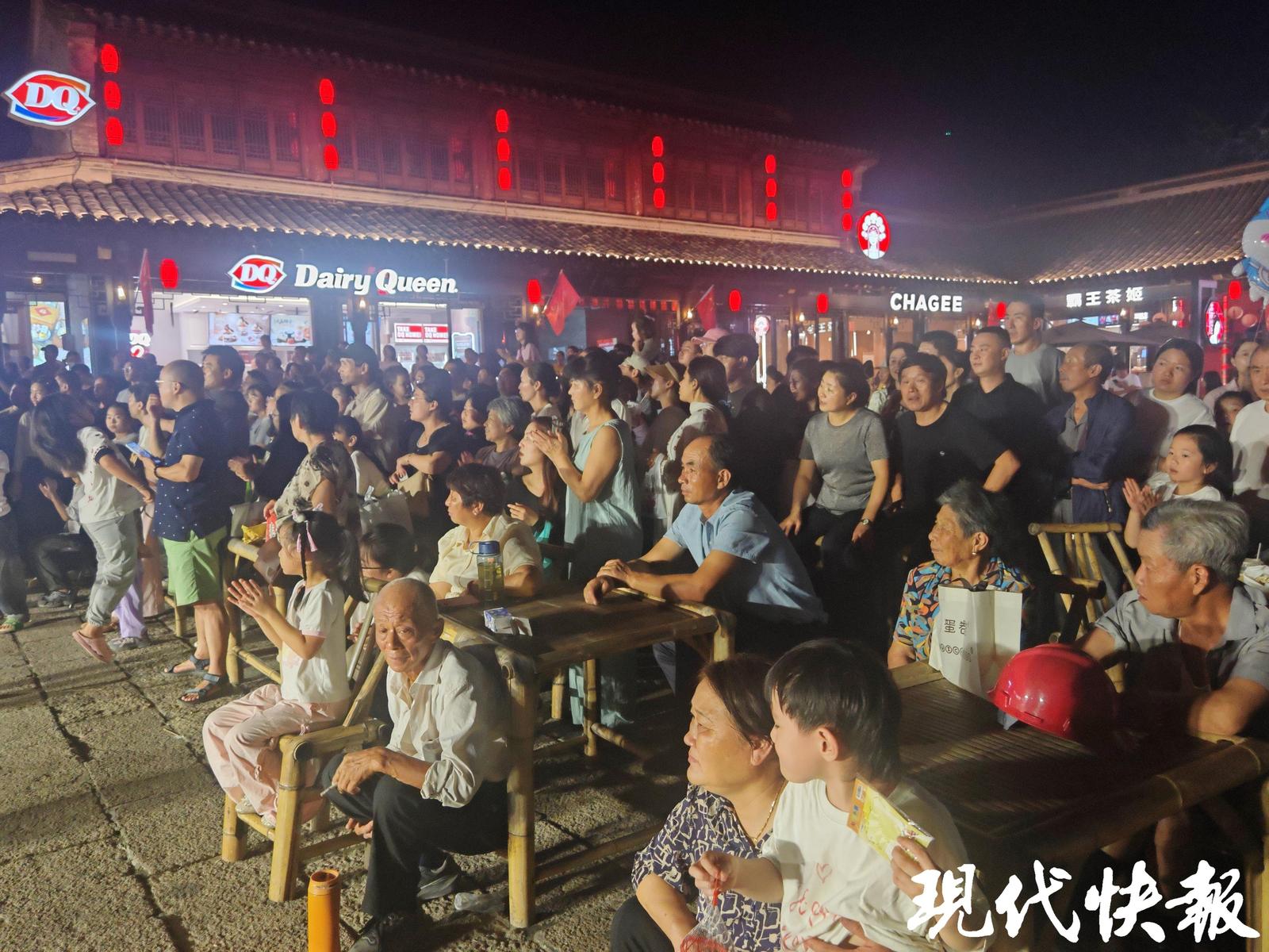 当晚,在泰州凤城河风景区华灯璀璨,人头攒动。泰州老街北广场、泰州望梅咖啡北侧都设置了观赛大屏,游客们点上啤酒、咖啡、小吃,坐在凤城河边享受比赛带来的激情,为苏超球队尽情呐喊助威。