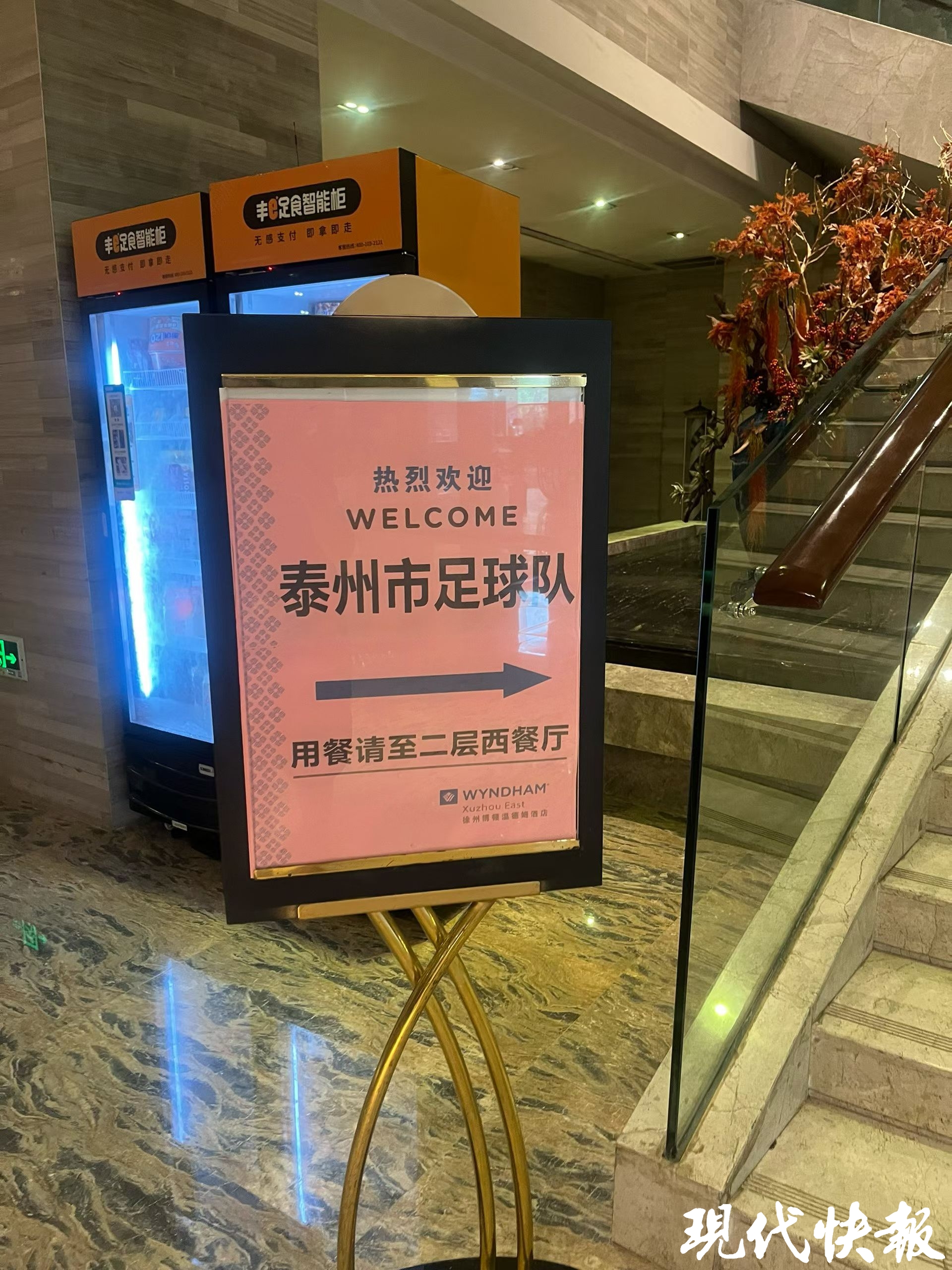 陈晨告诉现代快报记者,她和女儿都是苏超球迷,之前因为没抢到徐州主场的门票emo了好几天,但是抢到了5日当天的车票,酒店也提前订好了,因为酒店无法退订,就想着带女儿一起到徐州旅游,在第二现场观看球赛为泰州队加油。当天她入住酒店时,发现门口大屏上写着“欢迎泰州市足球队下榻”的字样,感觉好运就要降临了。