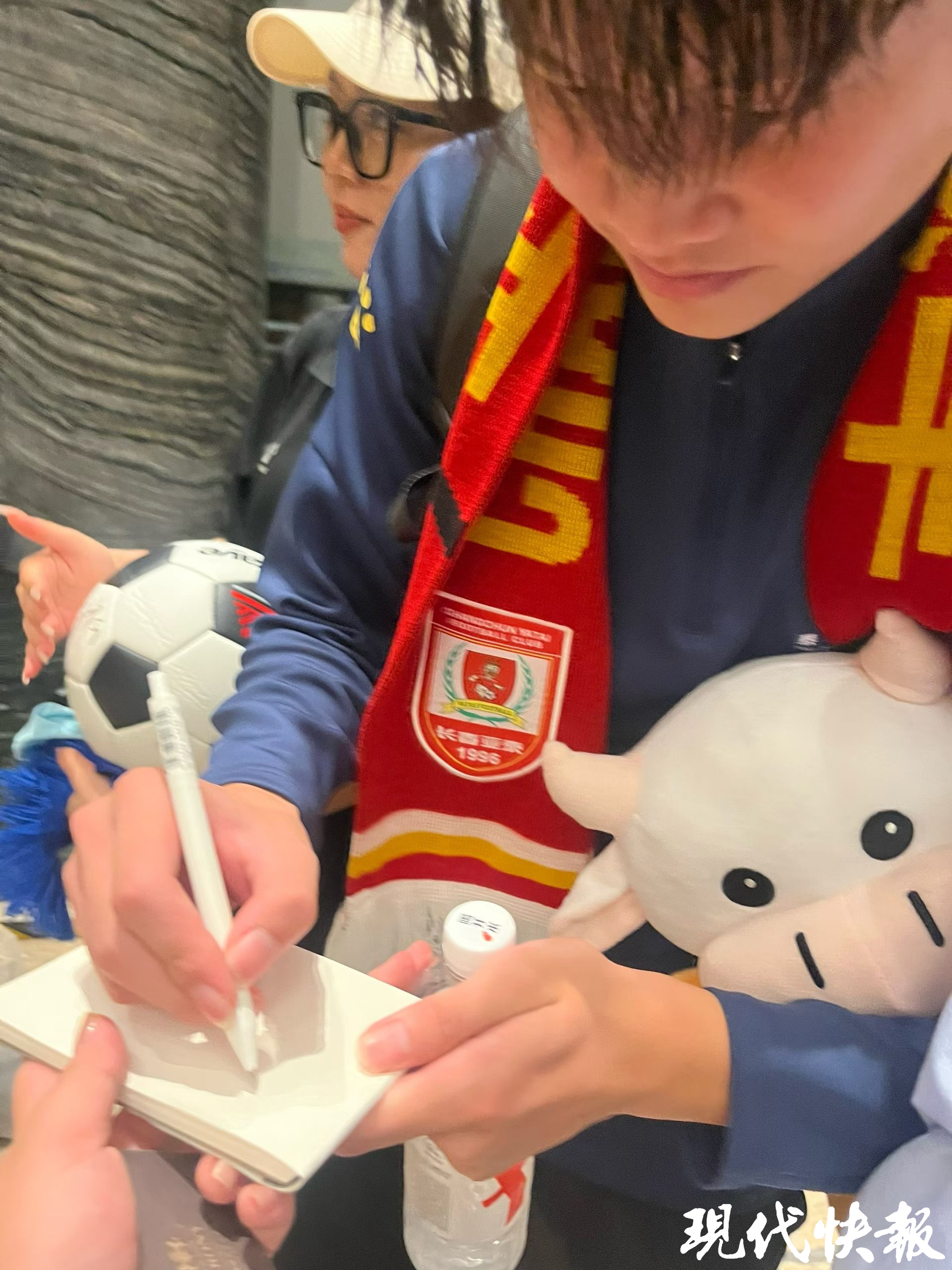 现代快报讯(记者 刘媛)幸福来得太突然!简直是天选的球迷!10月5日,苏超淘汰赛徐州队VS泰州队在徐州奥体中心开战,泰州球迷陈晨因没抢到门票,但提前预订的酒店无法退订,想着恰逢国庆节,到徐州旅游一趟也挺不错,意外的是,当她到达酒店时,竟发现泰州队也刚巧下榻在这家酒店,还和自己住在同一层楼。当晚,她虽然没机会到现场支持泰州队,但不仅和巴特、戴曜城等球员合了影,还拿到了很多球员的签名,可把她激动坏了。