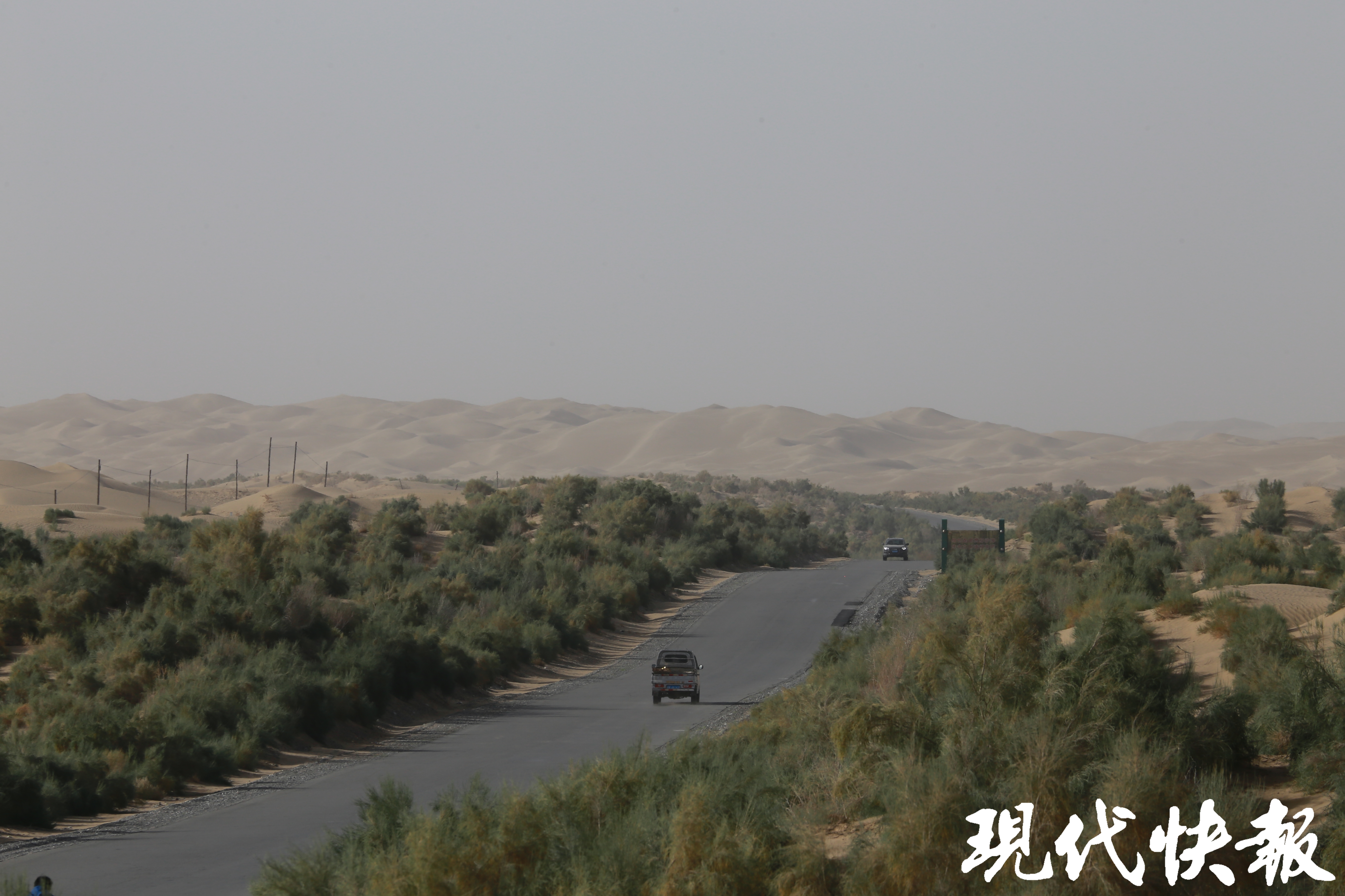 纵贯塔克拉玛干沙漠的的公路被固沙植物保护 是钟寅摄